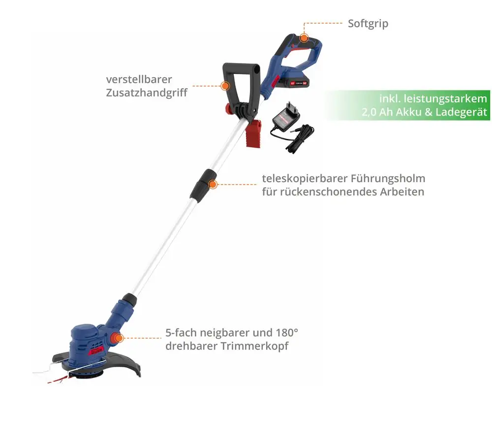 Wydajna akumulatorowa podkaszarka do trawy z grupy systemów akumulatorowych 18 V E³ to idealne narzędzie do precyzyjnego przycinania trawy wokół domu i w ogrodzie. Wyposażona w podwójne ostrze podkaszarka zapewnia wyjątkowo wydajną pracę, a obracana o 180° głowica podkaszarki znacznie ułatwia przycinanie krawędzi trawnika. Głowicę podkaszarki można również przechylać 5-krotnie, co dodatkowo zwiększa komfort pracy. Teleskopowy uchwyt prowadzący i bezstopniowo regulowany uchwyt dodatkowy umożliwiają dostosowanie podkaszarki do własnych potrzeb. Praktyczne: zapasowe ostrza są przechowywane bezpośrednio w dodatkowym uchwycie. Zintegrowana osłona roślin chroni wrażliwe rośliny podczas pracy. Akumulator litowo-jonowy 18 V / 2,0 Ah z serii Easy-Energy-Exchange zapewnia pełną elastyczność. Ochrona przed przeciążeniem i monitorowanie poszczególnych ogniw zapewniają bezpieczeństwo. Miękki uchwyt zapewnia wygodne trzymanie podczas pracy.
