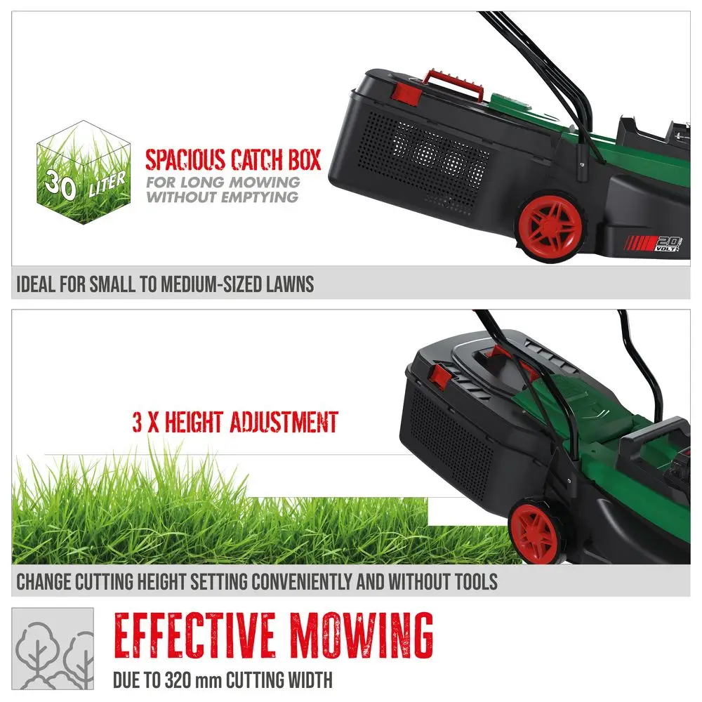 Zakres dostawy: Kosiarka akumulatorowa 320/20, akumulator 4 Ah i ładowarka 1,5 A