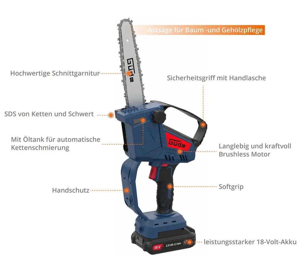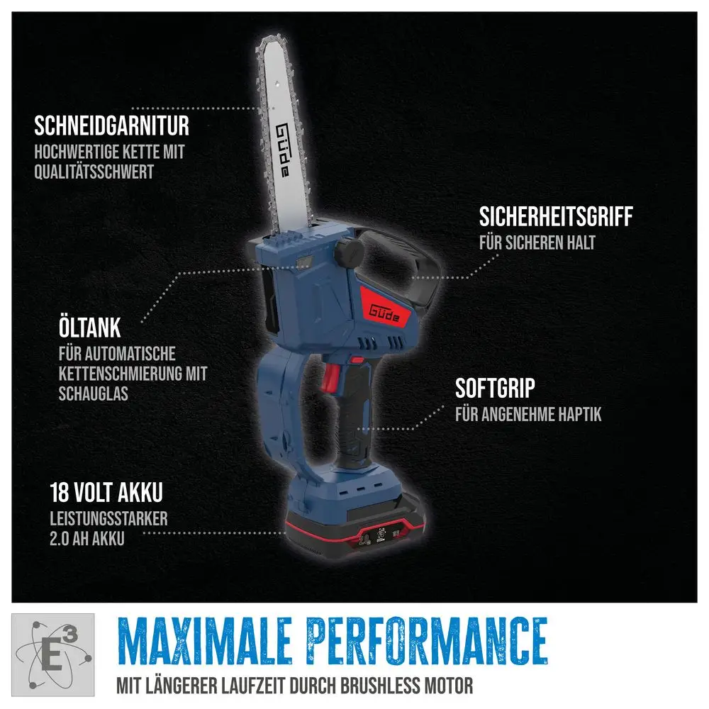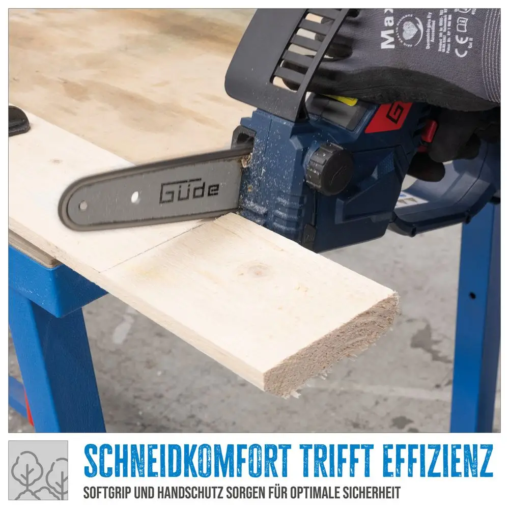 Akumulatorowa mini pilarka łańcuchowa Güde GMK 18-201-05-S to wydajna, niezwykle poręczna i wszechstronna pilarka do gałęzi, przeznaczona do przycinania drzew owocowych, okrzesywania i wszelkiego rodzaju prac związanych z pielęgnacją drewna wokół domu i w ogrodzie. Zakres dostawy obejmuje akumulator 2,0 Ah, pasującą ładowarkę, wysokiej jakości brzeszczot i wysokiej jakości łańcuch o długiej żywotności. Beznarzędziowy system szybkiego napinania łańcucha i automatyczne smarowanie łańcucha umożliwiają wydajną pracę bez irytujących przerw. Niewielka pilarka przekonuje przyjemnym dotykiem, niskim poziomem wibracji i wysoce wydajnym bezszczotkowym silnikiem elektrycznym, a także niską wagą zapewniającą niemęczącą pracę. Górny uchwyt bezpieczeństwa i osłona dłoni zapewniają najlepszą możliwą ochronę przed urazami.