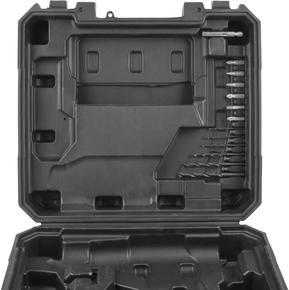 Wiertarka udarowa, akumulator 2Ah, szybka ładowarka 2,4A, walizka z metalowymi klamrami oraz 14 szt. akcesoriów do wierteł i bitów: