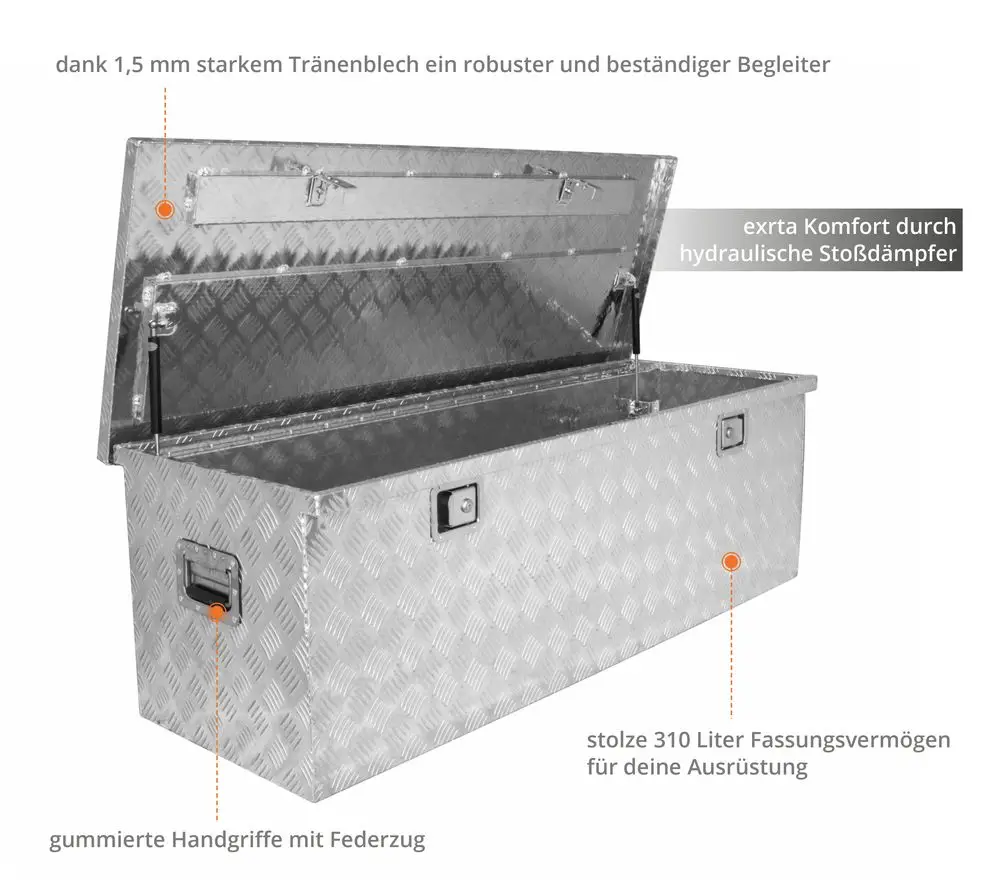 GT 310 to druga co do wielkości skrzynia transportowa Güde. Jest to bardzo wytrzymała, solidnie wykonana w pełni metalowa skrzynia o pojemności 310 litrów. Wykonany z aluminiowej blachy w szachownicę (tear plate), jest niezwykle wszechstronny, niezależnie od tego, czy znajduje się w warsztacie, piwnicy, przyczepie, na pickupie czy na płaskiej platformie - ten produkt oferuje 310 litrów bezpiecznej przestrzeni do przechowywania ładunku, sprzętu, narzędzi lub czegokolwiek innego, co chcesz bezpiecznie przechowywać lub transportować. Specjalne funkcje obejmują wygodne gumowane uchwyty z naciągiem sprężynowym i oczywiście solidny zamek do bezpiecznego przechowywania zawartości. Co więcej, skrzynia ta posiada hydrauliczne amortyzatory, które umożliwiają niezależne otwieranie i pozostawanie w pozycji otwartej pokrywy, pozostawiając obie ręce użytkownika wolne.