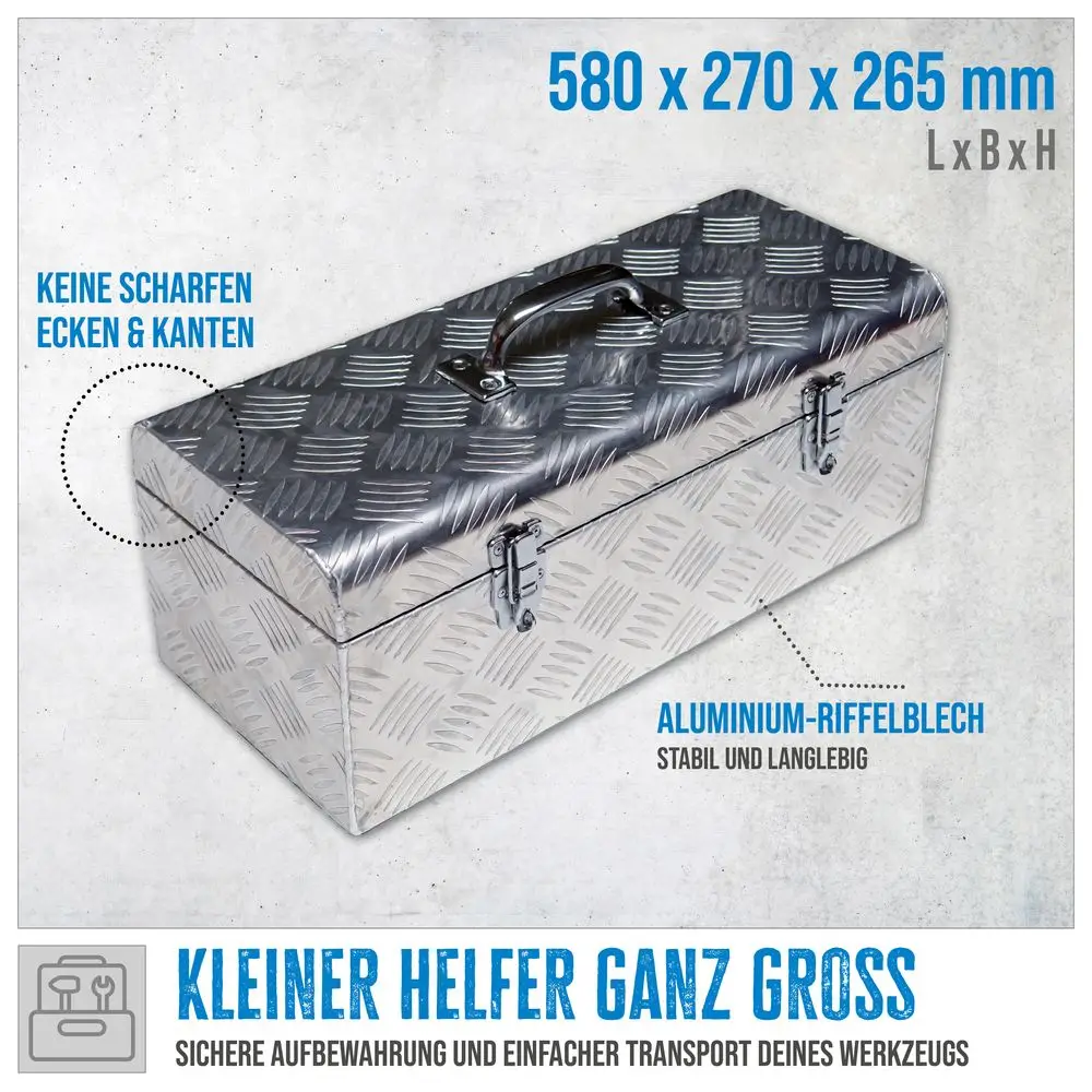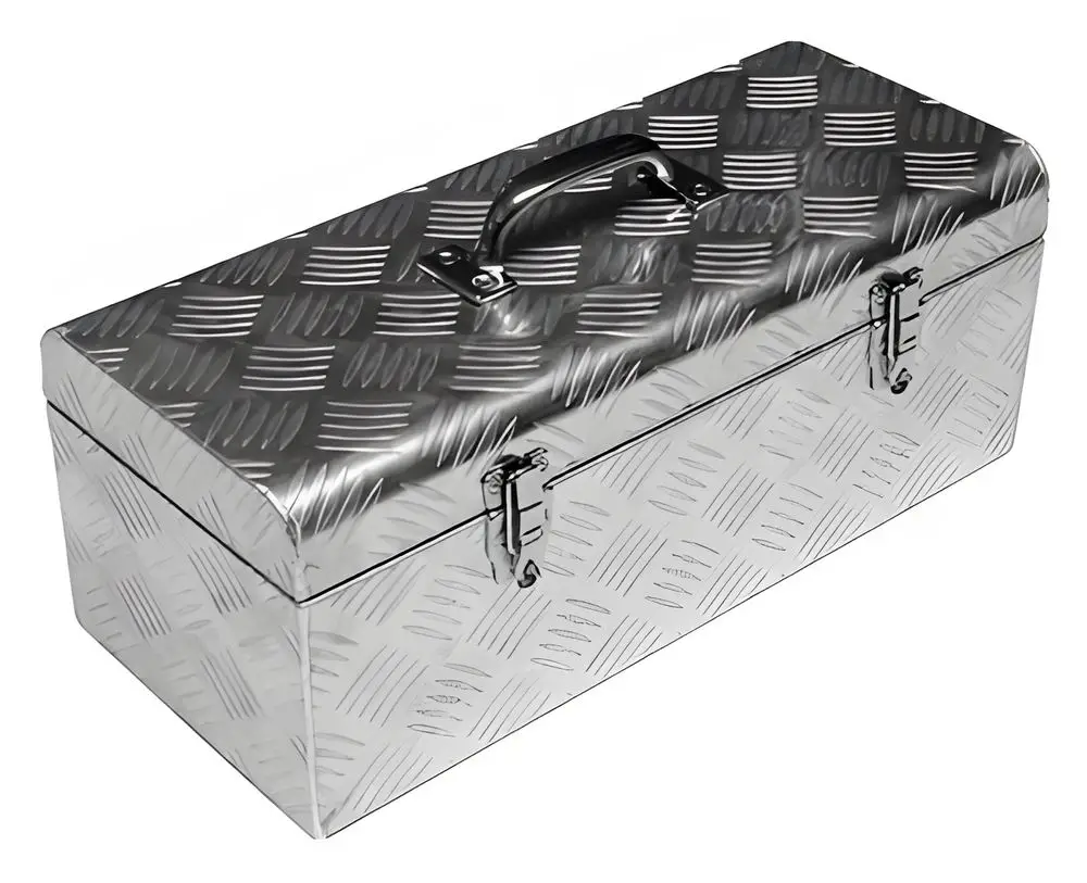 Wszechstronna, w pełni metalowa skrzynka wykonana z aluminiowej blachy szachownicowej (tear plate) do bezpiecznego przechowywania i transportu narzędzi. W domu, w warsztacie, na placu budowy, w samochodzie lub w pick-upie.
