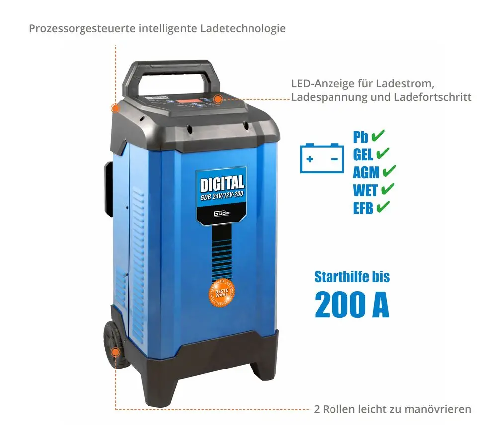 Cyfrowa ładowarka akumulatorów GDB 24V/12V-200 firmy Güde nadaje się do wszystkich standardowych akumulatorów 12 V i 24 V, a dzięki inteligentnej technologii ładowania jest bezpieczna i prosta w obsłudze. Sterowana mikroprocesorem technologia inwerterowa chroni wrażliwą elektronikę pojazdu, a tym samym umożliwia bezpośrednie i całkowicie bezpieczne ładowanie akumulatorów podłączonych w pojeździe. Szczególnie przyjazny dla akumulatora 10-stopniowy proces ładowania maksymalizuje żywotność akumulatora przy pełnej mocy. Obejmuje on w pełni automatyczną funkcję diagnostyki, ładowania i konserwacji, a także funkcję ratunkową, która może być używana szczególnie w przypadku głęboko rozładowanych akumulatorów (od 1,5 V). Funkcja szybkiego rozruchu (do 200 A) jest również bardzo przydatna w niektórych nieprzyjemnych sytuacjach. Urządzenie posiada również szereg technicznych mechanizmów zabezpieczających, takich jak ochrona przed przeładowaniem, zwarciem, przegrzaniem i odwrotną polaryzacją. Po zakończeniu procesu ładowania, tj. pełnym naładowaniu akumulatora, urządzenie automatycznie przełącza się w tryb ładowania podtrzymującego. Oznacza to, że może pozostać stale podłączone, aby utrzymać pełny stan naładowania akumulatora. Praktyczny wyświetlacz LED informuje o aktualnym prądzie ładowania, napięciu ładowania i postępie ładowania. Nie trzeba dodawać, że ładowarka jest odporna na iskry, zaciski akumulatora są w pełni izolowane, a dzięki dwóm kółkom urządzenie jest łatwe w manewrowaniu, mimo że waży niecałe 17 kg.