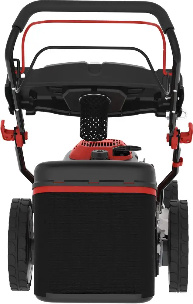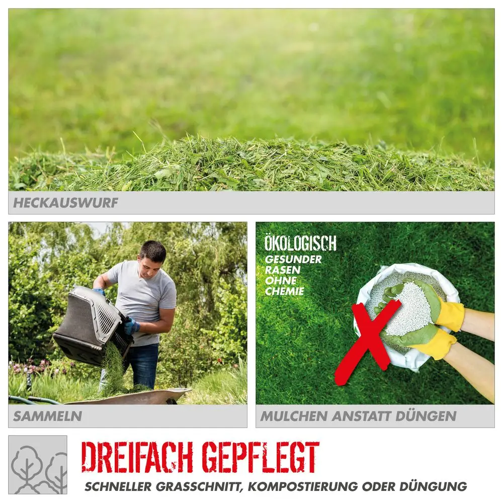 'Wydajna kosiarka z 4-suwowym silnikiem Power-Engine umożliwia niezawodną i wydajną pielęgnację trawników o powierzchni do 2200 m². Silnik o mocy 3,5 kW (4,8 KM) i pojemności 196 cm³ zapewnia wystarczającą moc do wymagających prac związanych z koszeniem. Centralna 6-pozycyjna regulacja wysokości koszenia umożliwia precyzyjne ustawienie wysokości koszenia w zakresie od 25 do 75 mm, a 65-litrowy worek na trawę ze wskaźnikiem poziomu napełnienia zapewnia dłuższe okresy koszenia bez konieczności częstego opróżniania. Duże koła na łożyskach kulkowych (tylne 300 mm, przednie 200 mm) gwarantują łatwe prowadzenie na każdym trawniku. Dla zwiększenia komfortu kosiarka jest wyposażona w ergonomicznie ukształtowany uchwyt z regulacją wysokości. Napęd na tylne koła z płynnie działającą przekładnią ułatwia pracę, szczególnie na większych obszarach i nierównym terenie. Dzięki wszechstronnym funkcjom, takim jak koszenie, zbieranie i mulczowanie, ta kosiarka jest naprawdę wszechstronna. Wysokiej jakości aluminiowe podwozie zapewnia stabilność i trwałość. Praktyczne dodatki, takie jak pompka spryskiwacza, złącze do czyszczenia oraz panel z uchwytem na kubek i schowkiem, uzupełniają wyposażenie.