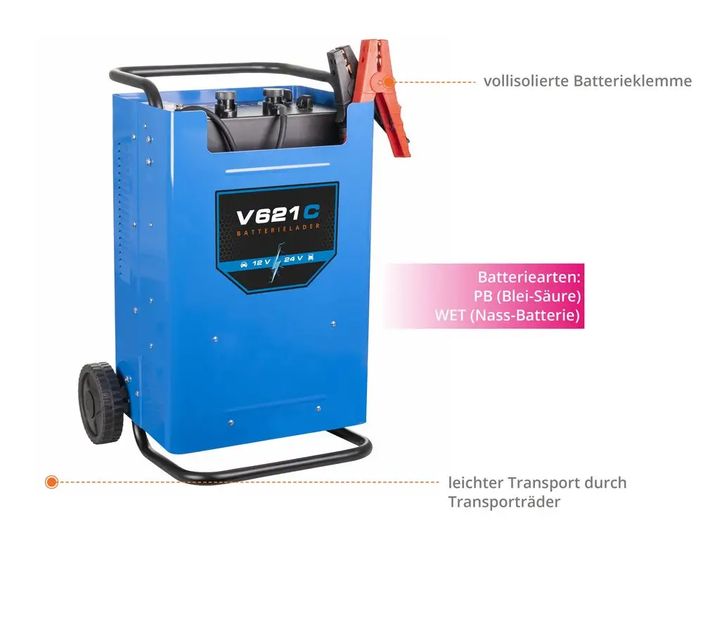 Ładowarka akumulatorów V 621 C firmy Güde nadaje się do rozruchu pojazdów silnikowych oraz ładowania i szybkiego ładowania akumulatorów samochodowych 12 V i 24 V o pojemności od 20 do 800 Ah. Standardowo wyposażona jest w niezawodny i wolny od zakłóceń analogowy wyświetlacz amperowy, 2-metrowy kabel ładujący, zabezpieczenie przed odwrotną polaryzacją i zabezpieczenie termiczne, a także w pełni izolowane zaciski akumulatora. Zakres dostawy obejmuje również 10 dodatkowych bezpieczników (100 A). Ważące nieco ponad 23 kg urządzenie jest również łatwe w manewrowaniu dzięki dużym kołom, co czyni go idealnym towarzyszem w warsztacie samochodowym.