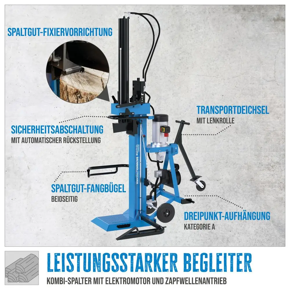 Łuparka do drewna GHS 1000/25TEZ-A została opracowana zgodnie z najnowszymi standardami jakości i bezpieczeństwa. Łuparka kombi jest idealna do rozłupywania metrowych kłód w lesie lub na przydomowym terenie. Potężny silnik elektryczny o mocy 5,5 kW zasila jedną z dwóch wysoce wydajnych pomp hydraulicznych i precyzyjnie wyskalowany zawór sterujący, umożliwiając operatorowi wybór między 2 poziomami prędkości posuwu. Alternatywnie, trzypunktowy układ zawieszenia i przekładnia WOM umożliwiają mobilne użytkowanie ciągnika w lesie lub na składowisku polderowym. Hydrauliczno-mechaniczny podnośnik kłód bez trudu podnosi nawet ciężkie kłody na miejsce i zapewnia przyjazne dla pleców i wygodne rozłupywanie. Urządzenie do mocowania materiału do rozłupywania umożliwia zamocowanie materiału do rozłupywania przed procesem rozłupywania bez konieczności jego przytrzymywania. Długie ostrze rozłupujące wykonane jest z częściowo hartowanej stali specjalnej zapewniającej długą żywotność. Automatyczne resetowanie klina rozłupującego ze zintegrowanym wyłącznikiem bezpieczeństwa oferuje optymalną ochronę i zapewnia wydajne i niemęczące rozłupywanie. Dwuręczna obsługa bezpieczeństwa, włącznik/wyłącznik i obustronny łapacz drzazg to kolejne środki zapewniające bezpieczną i efektywną pracę, a trzypunktowe zawieszenie i dyszel transportowy umożliwiają łatwy transport i manewrowanie.
