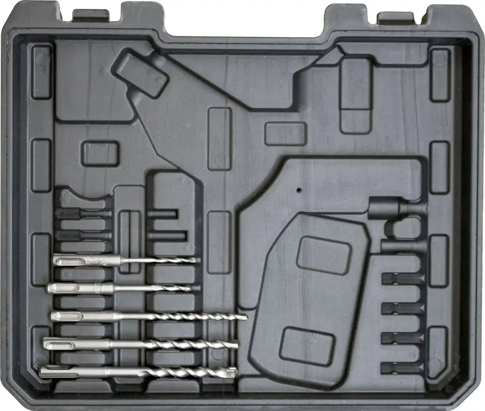 Młotowiertarka, szybka ładowarka 3,0 A, akumulator litowo-jonowy 18 V/2,0 Ah, walizka z metalowymi klamrami i 5 wierteł SDS-plus (