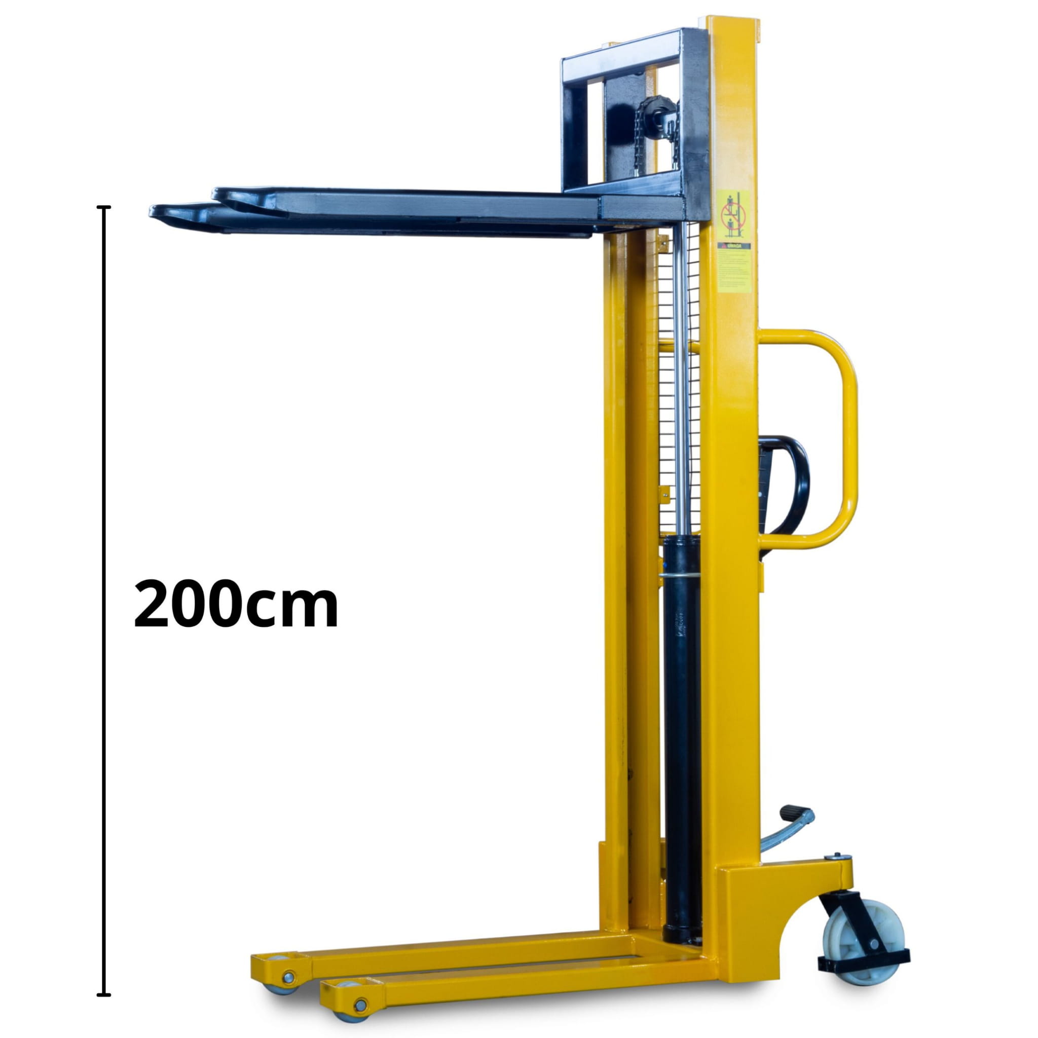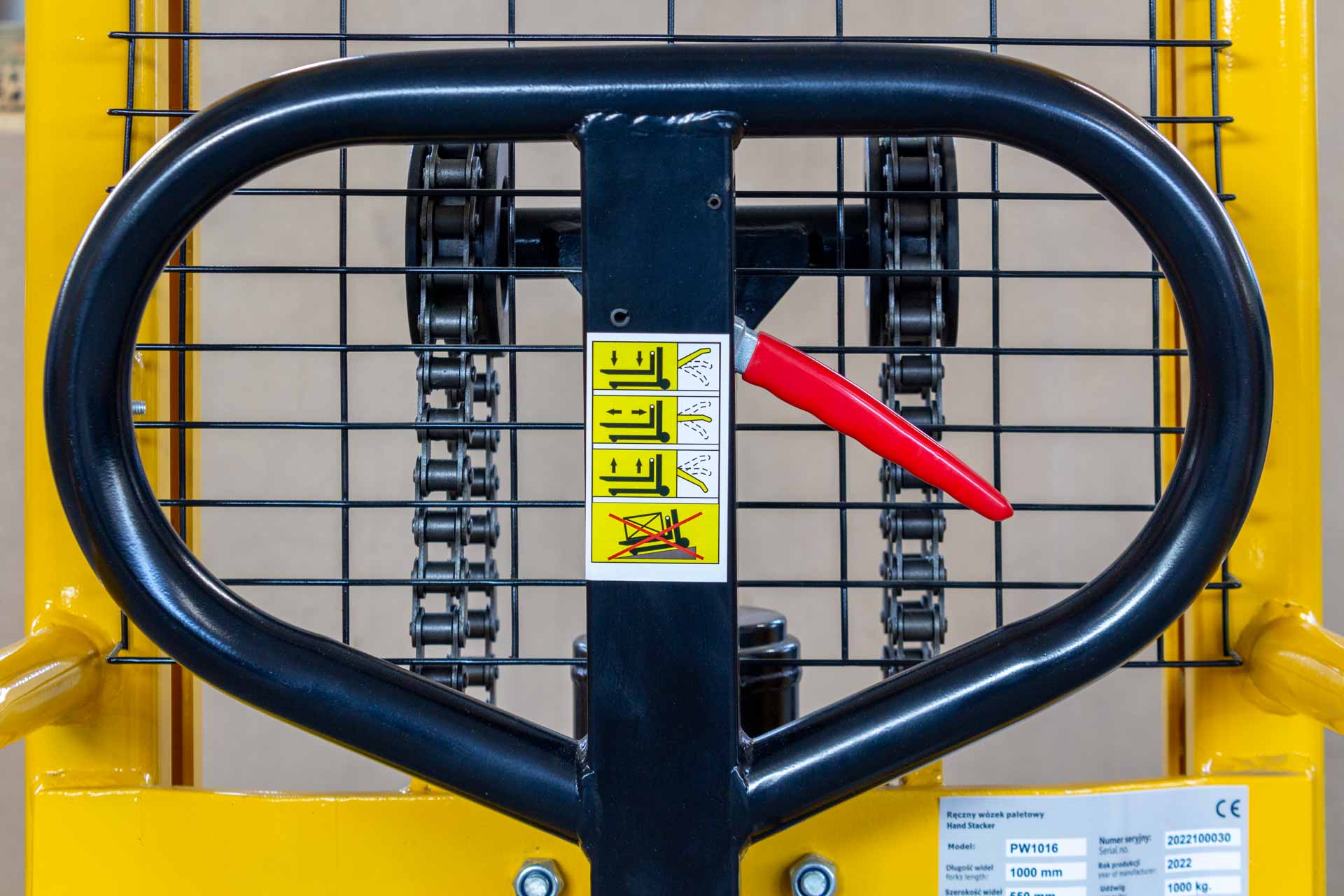 Wózek masztowy PW1016 to urządzenie stworzone z myślą o prostocie i trwałości. W całości wykonany ze stali, spawany w kluczowych punktach nośnych, odporny na odkształcenia i zużycie mechaniczne. Obsługa jest intuicyjna – operator może wybrać jedną z dwóch metod podnoszenia: dźwignią ręczną lub nożnym pedałem. Obie metody napędzają ten sam niezawodny układ hydrauliczny, dzięki czemu podnoszenie jest stabilne nawet przy pełnym obciążeniu.