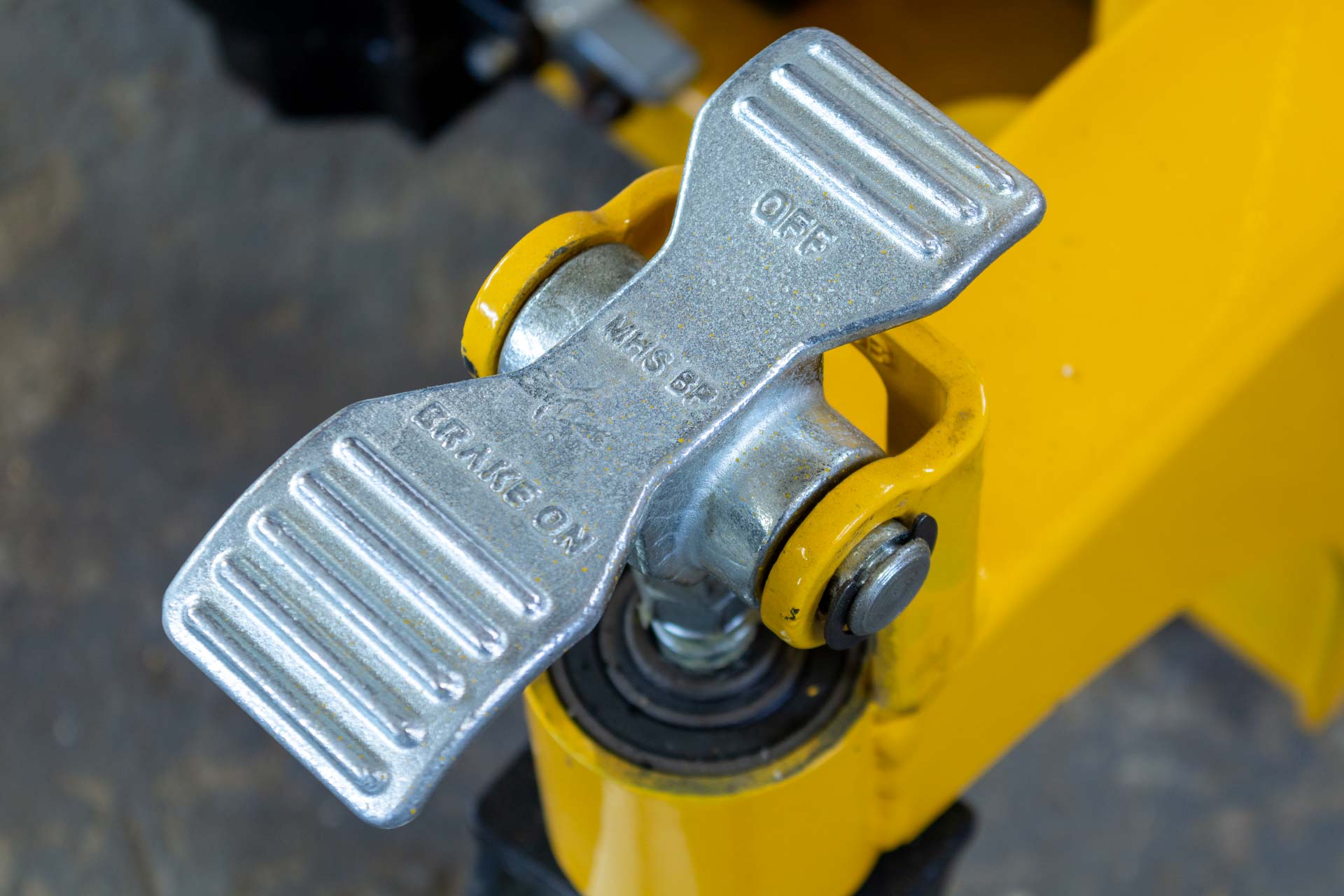 Wózek wyposażono w hamulec nożny postojowy, który blokuje tylne koła, zwiększając bezpieczeństwo podczas postoju lub załadunku na pochyłej powierzchni. Nylonowe koła są trwałe, odporne na zużycie i nie pozostawiają śladów na posadzkach przemysłowych.