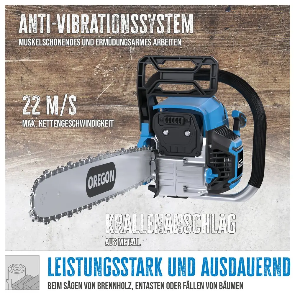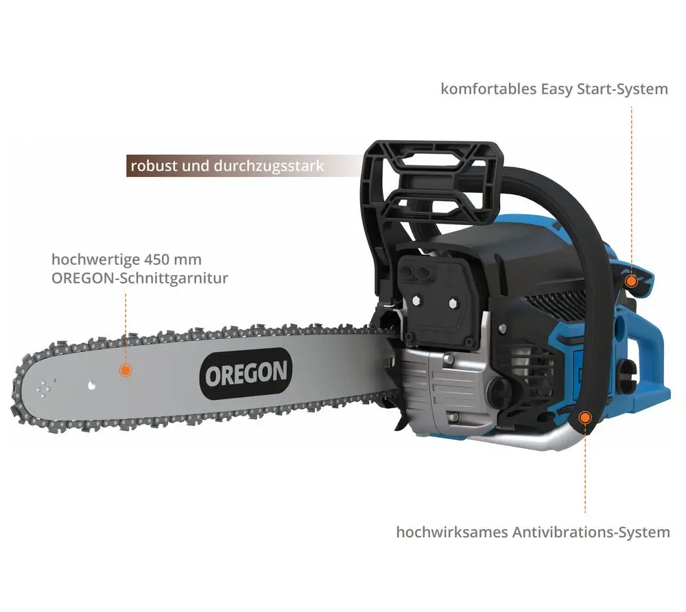 Pilarka spalinowa Güde KS 450-55 o mocy 3,1 KM, z wysokiej jakości zestawem tnącym OREGON 450 mm i mocnym dwusuwowym silnikiem 55 cm3 jest wszechstronnym urządzeniem wśród pilarek Güde. Model 450-55 jest idealny do wszystkich lekkich i średnich prac związanych z drewnem opałowym i może być również używany do okazjonalnego ścinania drzew. Sprężynowy rozrusznik nawrotny, ssanie i pompka rozruchowa umożliwiają szybki i łatwy rozruch bez większego wysiłku. Model 450 wyróżnia się również bardzo skutecznym systemem antywibracyjnym oraz beznarzędziowym dostępem do filtra powietrza i świecy zapłonowej. Nie trzeba dodawać, że KS 450-55 spełnia aktualne limity emisji EURO-V i jest testowany zgodnie z surowymi normami bezpieczeństwa.