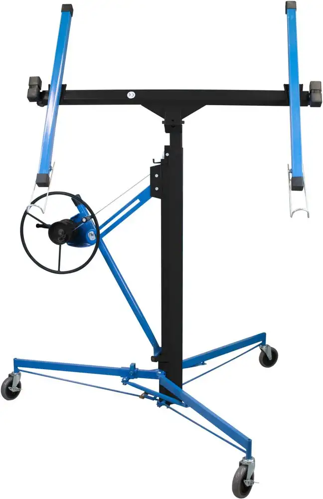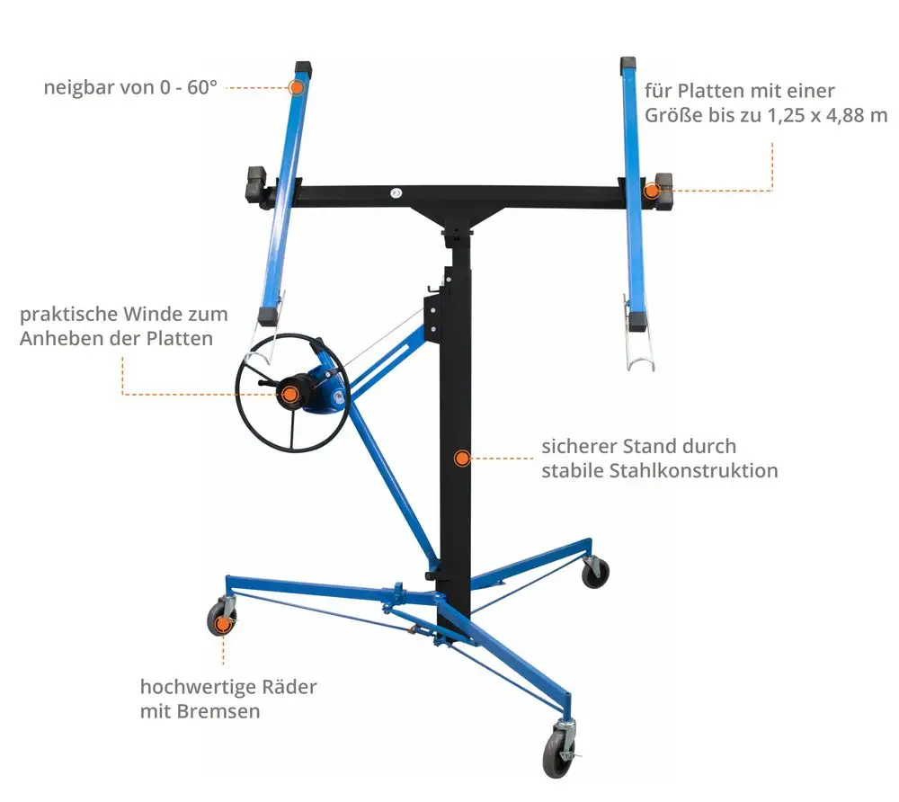 Podnośnik do suchej zabudowy Güde podnosi ładunki takie jak płyty gipsowo-kartonowe, płyty wiórowe, panele drewniane i metalowe oraz panele sufitowe o wadze do 68 kg do montażu nad głową. Podnośnik do suchej zabudowy znacznie ułatwia montaż i szybko staje się niezastąpionym pomocnikiem. Wyposażony w 3 duże kółka skrętne z ramieniem stabilizującym, wsporniki na ramionach nośnych i wysokiej jakości gumowe podkładki zapewniające bezpieczne trzymanie paneli. Praktyczny mechanizm korbowy jest całkowicie wstępnie zmontowany. Podnośnik można przechowywać i transportować w sposób oszczędzający miejsce.