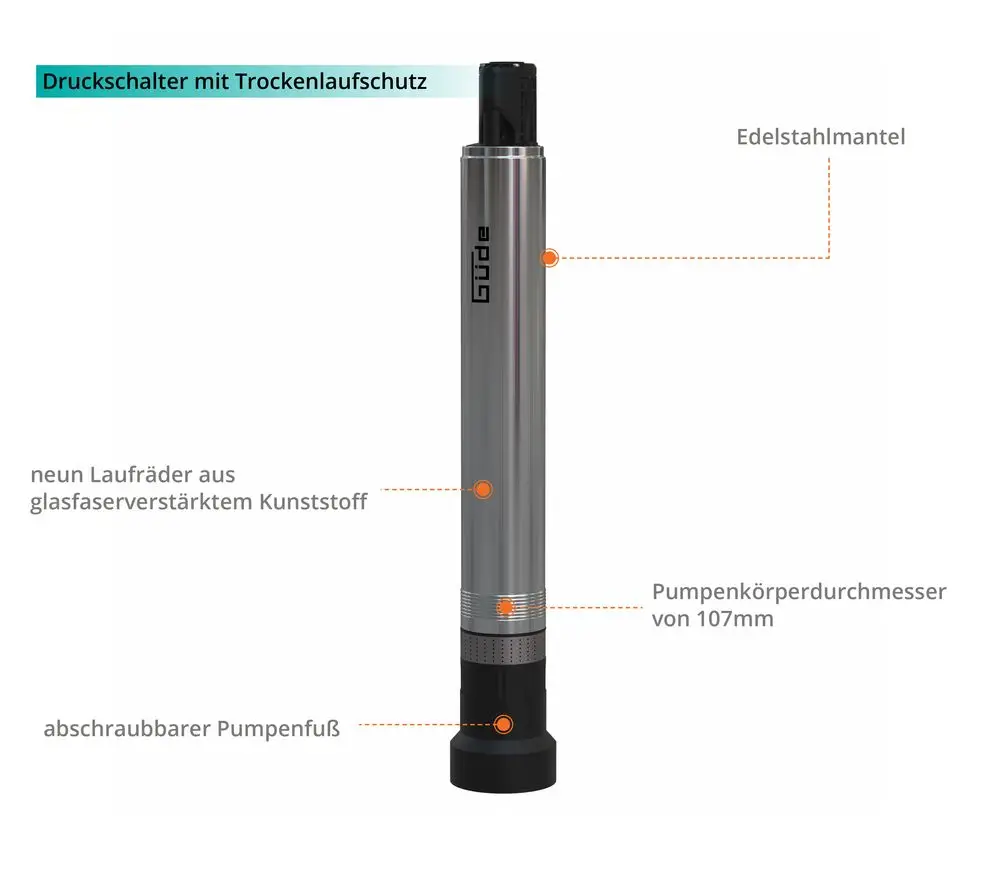 Pompa głębinowa z wyłącznikiem ciśnieniowym GTT 900.1 działa przy napięciu sieciowym 230 V i częstotliwości 50 Hz. Posiada silnik o mocy 0,9 kW (odpowiednik 900 W) i 9 wirników. Dzięki imponującemu natężeniu przepływu wynoszącemu 4500 l/h może obsługiwać nawet duże ilości wody. Pompa osiąga maksymalną wysokość tłoczenia 60 m i może zanurzyć się na głębokość do 17 m. Dzięki maksymalnemu rozmiarowi ziarna 1,5 mm jest wytrzymała i niezawodna. Przewód połączeniowy ma duże wymiary i mierzy 2000 cm długości. Wydajna pompa, która skutecznie pompuje wodę w szerokim zakresie zastosowań.