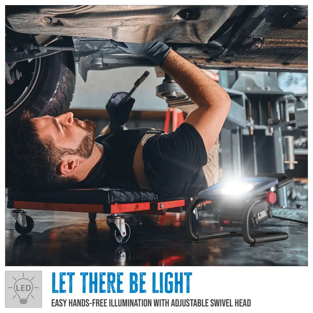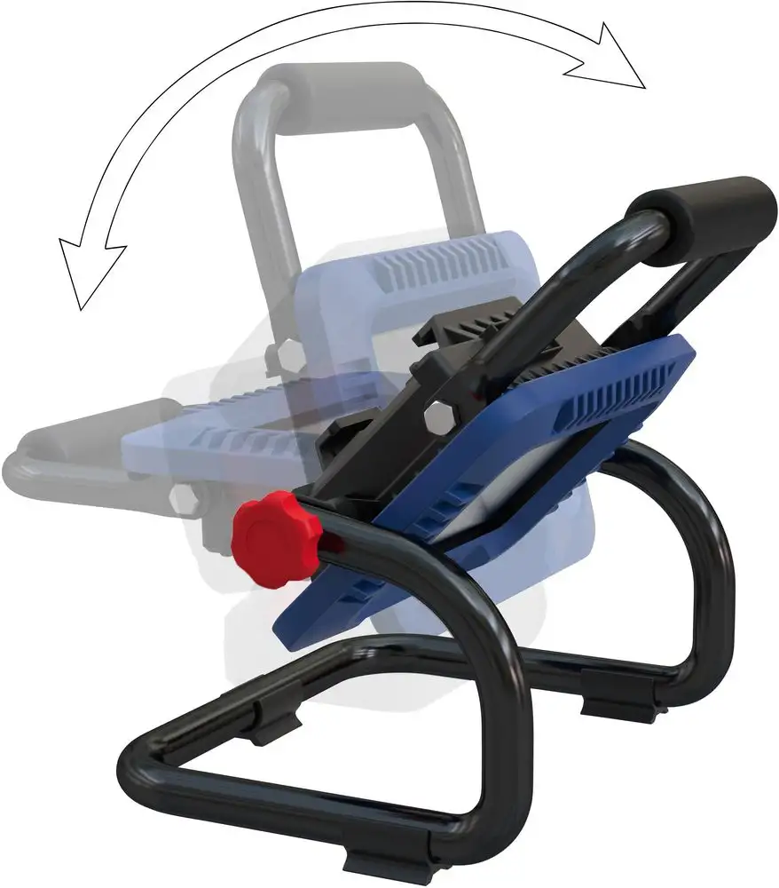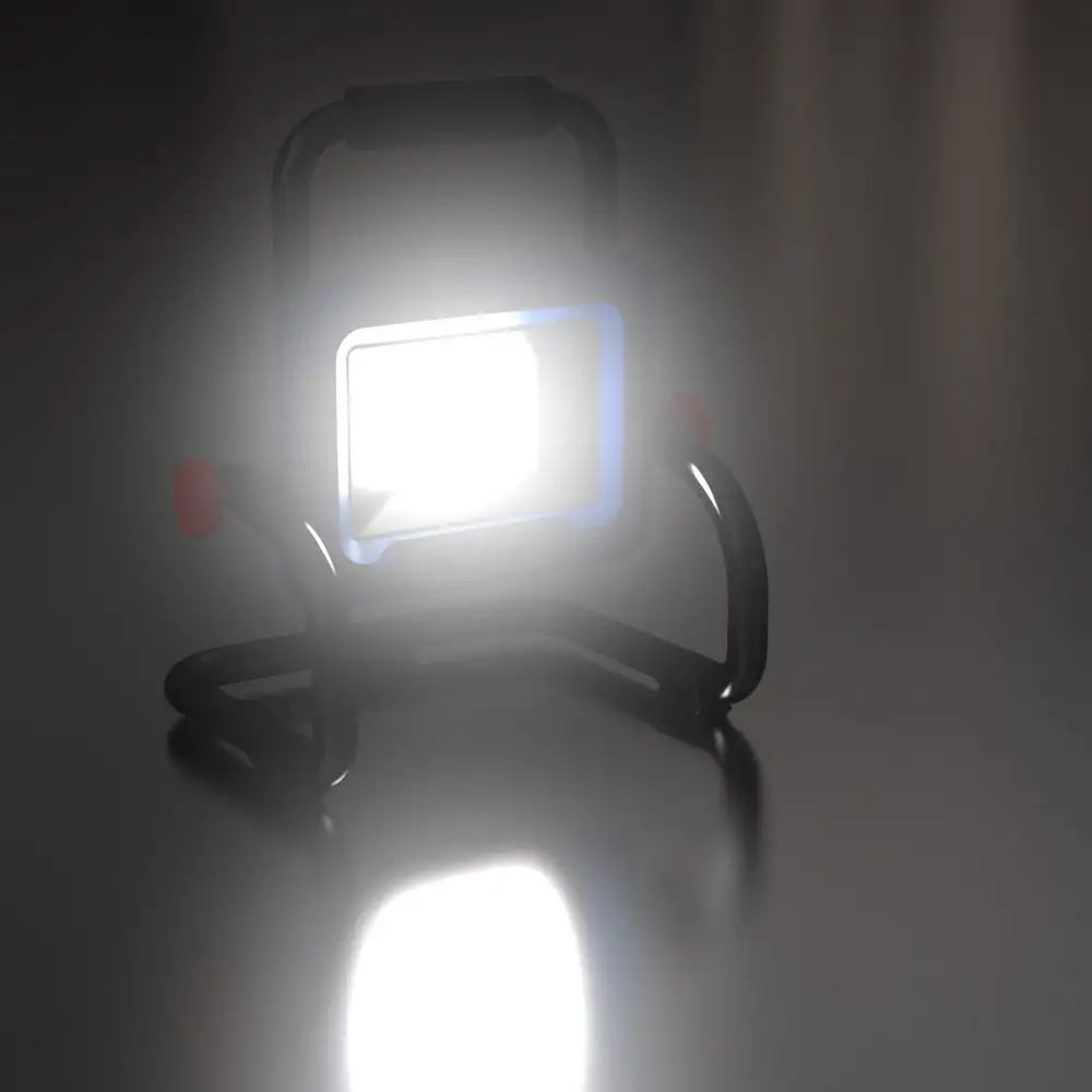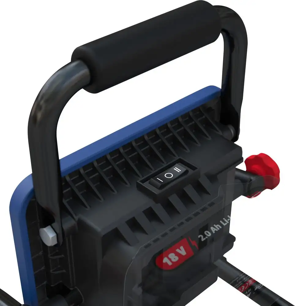 Wytrzymały uchwyt z miękkim uchwytem sprawia, że ten lekki i poręczny reflektor jest łatwy w transporcie. 100 mocnych, a jednocześnie energooszczędnych diod LED SMD zapewnia strumień świetlny o natężeniu 2000 lumenów (poziom 1) lub 4800 lumenów (poziom 2). Obrotowa głowica o 120° pozwala precyzyjnie dopasować reflektor do wymaganego obszaru roboczego.