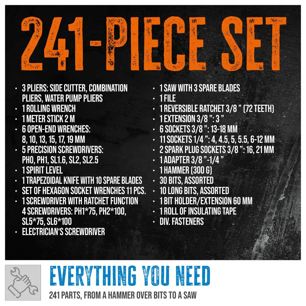 Idealne wyposażenie podstawowe lub początkowe dla każdego. 241-częściowy zestaw narzędzi ze stali chromowo-wanadowej i węglowej w poręcznej walizce.