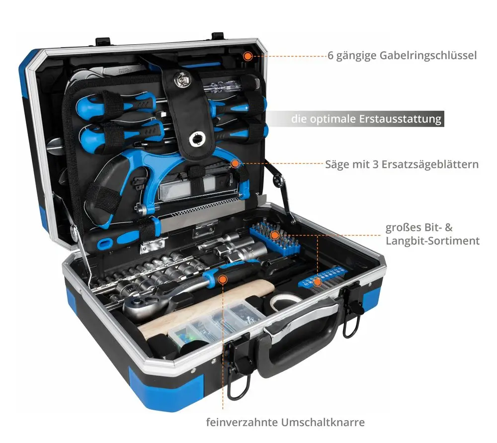 Poręczna skrzynka narzędziowa zawierająca idealne wyposażenie podstawowe lub początkowe. Ten 241-częściowy zestaw narzędzi wykonanych ze stali chromowo-wanadowej i węglowej obejmuje klasyczny asortyment śrubokrętów, grzechotkę z różnymi nasadkami, kilka szczypiec i kluczy oczkowych otwartych, a także piłę i duży asortyment bitów, w tym długie bity. Oczywiście w zestawie znajduje się również poziomica, metrówka, młotek i klucz. Ponadto walizka zawiera praktycznie posortowane pudełko z różnymi elementami złącznymi, takimi jak gwoździe i śruby. Czy to do własnego domu, czy jako prezent dla początkujących dzieci - ten wszechstronny zestaw jest idealnym wyborem.