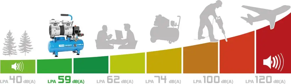 Sprężarka Airpower 105/8/6 Silent wyróżnia się kompaktową konstrukcją i cichą pracą. Napędzana bezpośrednio, bezolejowa i bezobsługowa 2-cylindrowa jednostka generuje poziom ciśnienia akustycznego wynoszący zaledwie 59 dB(A) podczas pracy, a zatem jest znacznie cichsza niż wiele innych sprężarek. Stalowy zbiornik o pojemności 6 litrów magazynuje sprężone powietrze, dzięki czemu sprężarka nie musi pracować w trybie ciągłym. Kompaktowa konstrukcja, niewielka waga własna i praktyczny uchwyt transportowy, który jest połączony ze zbiornikiem, zapewniają maksymalną możliwą mobilność. Dodatkowe wyposażenie obejmuje łatwy do odczytu manometr roboczy do odczytu ciśnienia, mechaniczny wyłącznik ciśnieniowy, a także złącze sprężonego powietrza do szybkiego podłączania urządzeń sprężonego powietrza.