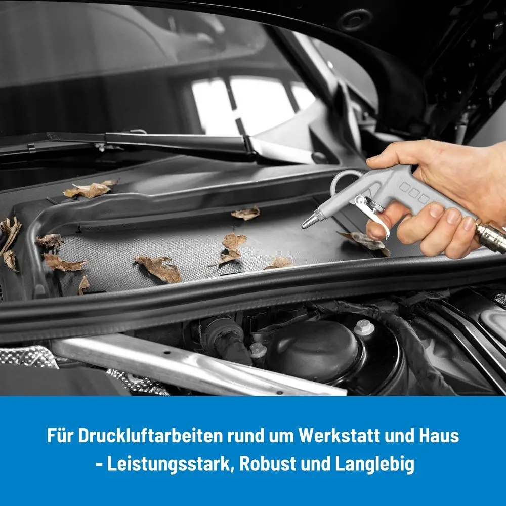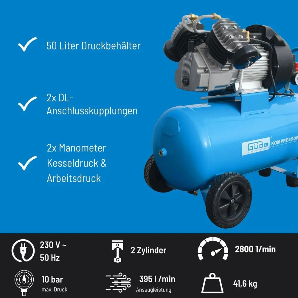 Solidny kompresor warsztatowy ze zbiornikiem ciśnieniowym o pojemności 50 litrów i ciśnieniem roboczym 10 barów. Idealnie nadaje się do wszystkich prac wymaganych przez majsterkowiczów i rzemieślników. Dzięki wydajności ssania wynoszącej ok. 400 ltr i efektywnej objętości tłoczenia wynoszącej 300 ltr, może być używany do krótkotrwałych prac z kluczem udarowym podczas wymiany opon, a także do mniejszych prac malarskich. Do dwóch złączy sprężonego powietrza można jednocześnie podłączyć dwa odbiorniki, a 2 manometry niezawodnie wskazują zarówno bieżące ciśnienie w zbiorniku, jak i ustawione ciśnienie robocze.