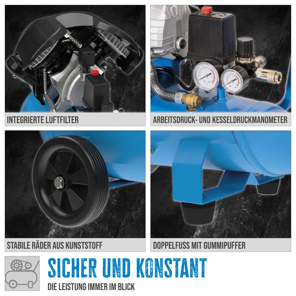 Praktyczny i dobrze przemyślany zestaw kompresora z bogatym wyposażeniem do wszelkich prac w warsztacie i garażu. Wydajny kompresor V o pojemności wlotu 320 litrów i ciśnieniu roboczym 10 barów zapewnia wystarczającą ilość powietrza do zasilania kilku narzędzi niezbędnym ciśnieniem za pomocą dwóch złączy sprężonego powietrza. Jeden manometr ciśnienia roboczego i jeden manometr ciśnienia w zbiorniku zapewniają precyzyjne monitorowanie ciśnienia i poziomu w zbiorniku. Wreszcie, zbiornik o pojemności 50 litrów zapewnia długi i wydajny czas pracy bez czasochłonnego uzupełniania objętości bojlera.