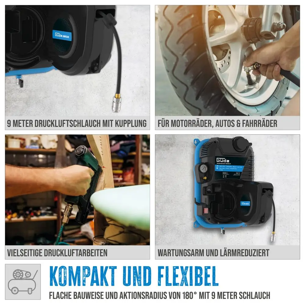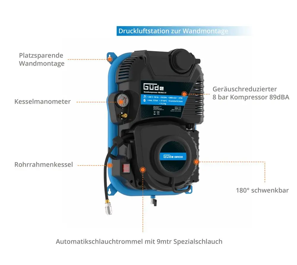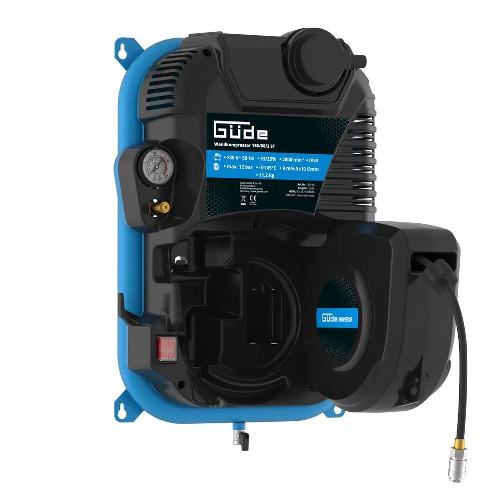 Kompresor ścienny Güde GWK 160/8/2 ST to niezbędny element wyposażenia każdego garażu lub warsztatu. Jak sugeruje nazwa modelu, stację sprężonego powietrza można zamontować na dowolnej ścianie, aby zaoszczędzić miejsce i nie zajmować cennej powierzchni podłogi. Cicha sprężarka zapewnia ciśnienie 8 barów, a obracający się o 180° bęben na wąż zapewnia promień roboczy 9 m. Kompaktowo zainstalowana sprężarka jest oczywiście bezolejowa, a zatem nie wymaga konserwacji. Wzmocniony tkaniną wąż sprężonego powietrza jest odporny zarówno na olej, jak i na temperatury do -20° i można po nim bez problemu przejeżdżać samochodem pod ciśnieniem.