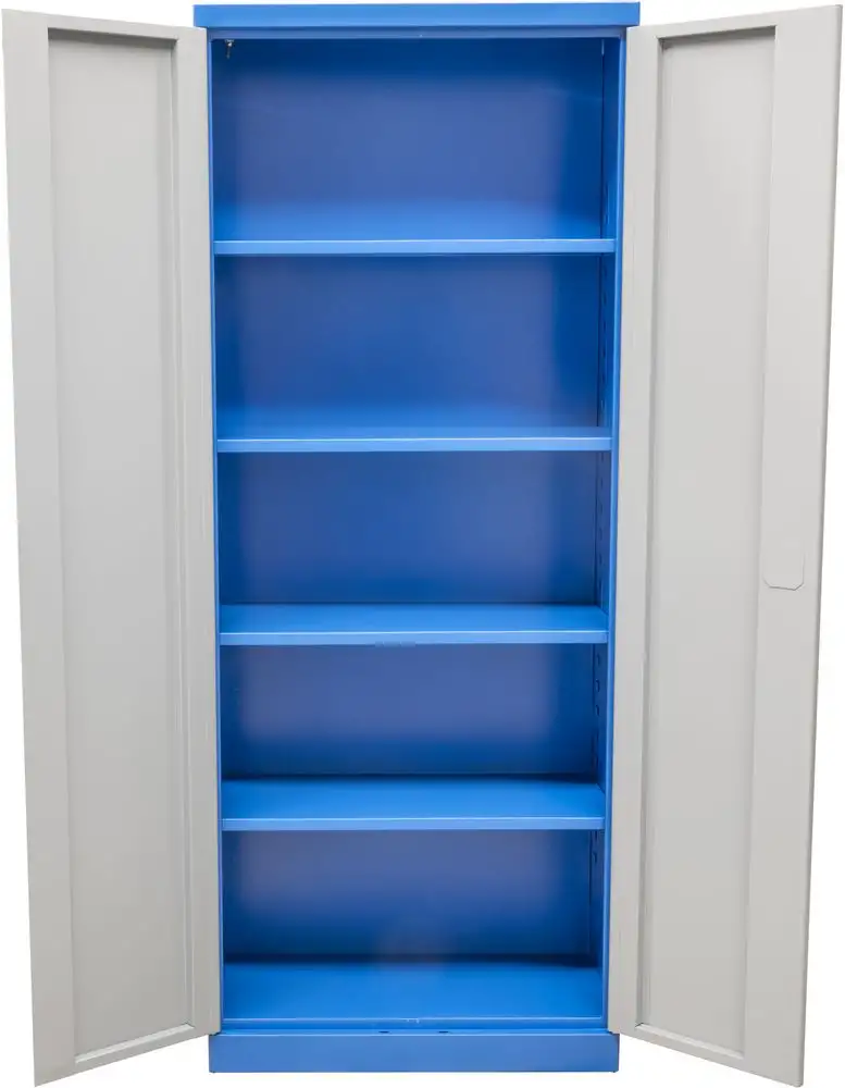 Ta stalowa szafka o zaokrąglonych krawędziach jest dostarczana w pełni zmontowana. Spawana, bardzo wytrzymała, całkowicie stalowa konstrukcja z powłoką proszkową ma 4 półki, których wysokość można zmieniać zgodnie z własnymi wymaganiami. Dzięki maksymalnemu obciążeniu wynoszącemu 50 kg na półkę, szafka ta jest również przeznaczona do cięższego sprzętu i narzędzi oraz stanowi doskonałą opcję do przechowywania i organizacji. Przy szerokości 790 mm, głębokości 380 mm i wysokości 1930 mm, szafa ta ma mnóstwo miejsca do przechowywania wszelkiego rodzaju materiałów roboczych, do których dostęp jest niezwykle wygodny dzięki bardzo szerokiemu kątowi otwarcia dwóch drzwi na zawiasach wynoszącemu ponad 180 stopni.