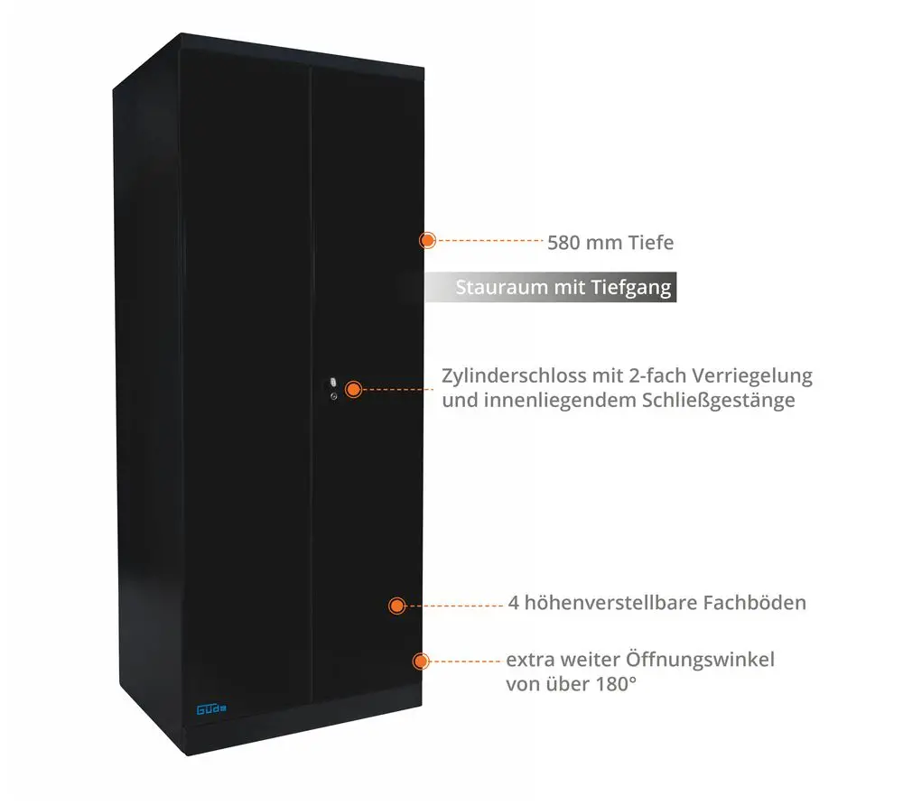 Szafa narzędziowa Güde TYPE BG Black Line jest idealna do warsztatów, biur i innych miejsc pracy, w których wymagane jest przestronne i bezpieczne rozwiązanie do przechowywania. Wyprodukowana w ponadczasowej konstrukcji z zaokrąglonymi krawędziami, dwoje drzwi na zawiasach oferuje wyjątkowo wygodny kąt otwarcia ponad 180°, zawiasy i blokada znajdują się wewnątrz, a wysokość czterech półek można dostosować do wymagań przestrzennych. Wyprodukowany w UE, produkt ten oznacza najwyższe standardy jakości - zarówno pod względem użytych materiałów, jak i całego procesu produkcyjnego aż do gotowego produktu. Otrzymujesz tutaj spawaną, całkowicie stalową konstrukcję zaprojektowaną na dziesięciolecia użytkowania, która jest oczywiście dostarczana w pełni zmontowana.