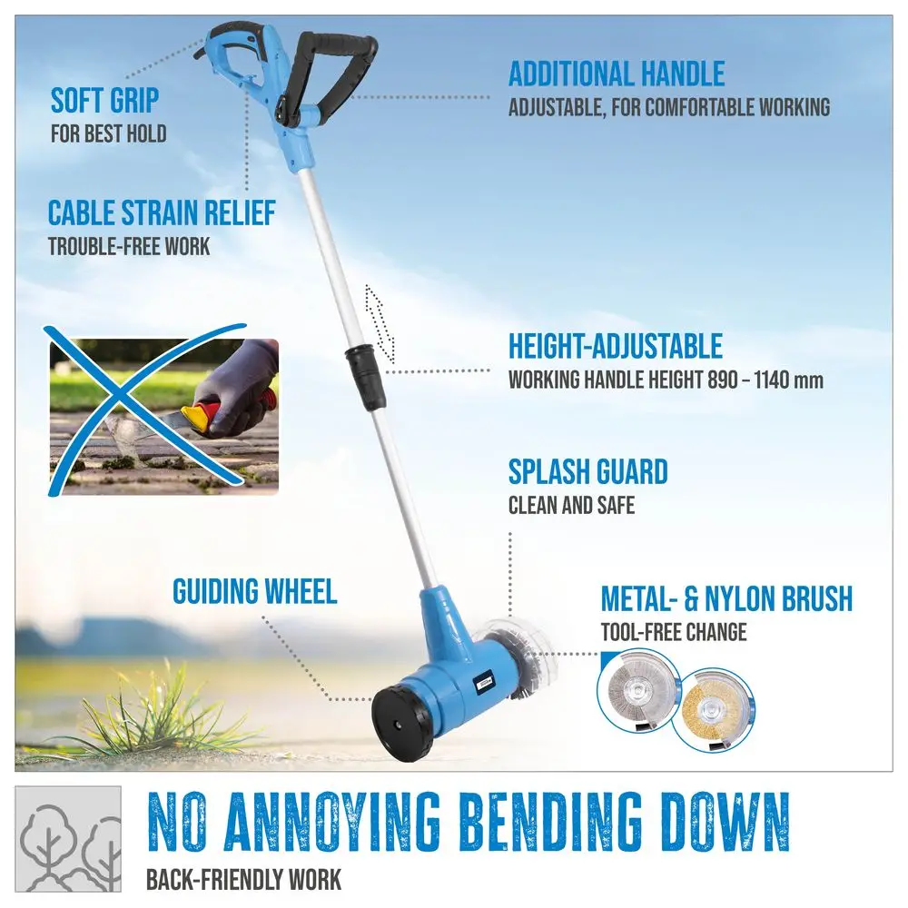 Elektryczny odkurzacz do fug oszczędza żmudnej pracy. Dzięki kółku prowadzącemu można go łatwo przetoczyć po fugach i zmieść nawet uporczywy brud. Nie musisz się nawet schylać, wystarczy, że popchniesz urządzenie przed sobą. Aluminiowa rura o regulowanej wysokości zapewnia wygodną pracę w pozycji wyprostowanej. Wszechstronna osłona przeciwbryzgowa umożliwia czystą pracę. Oprócz brudu, odkurzacz do fug usuwa również mech i chwasty. Praktyczny pomocnik, bez którego nie będziesz chciał się obyć.