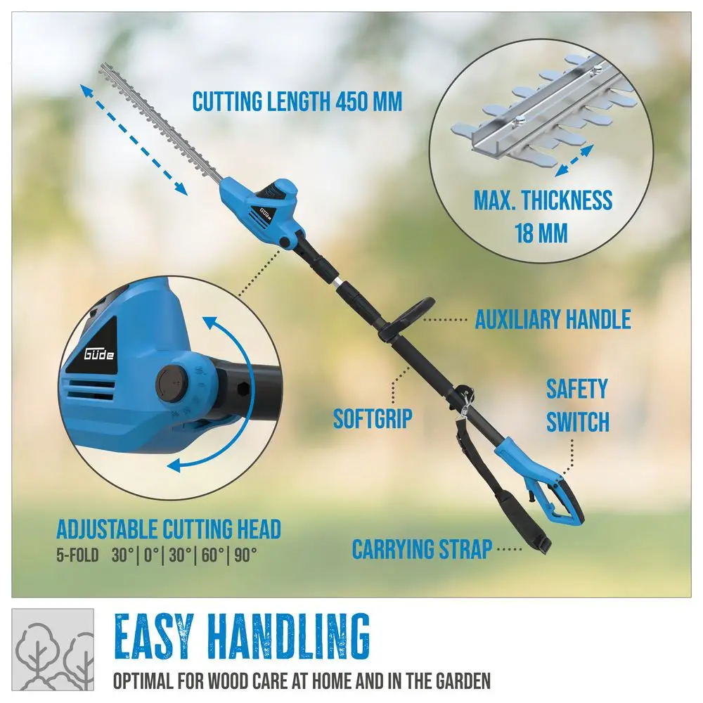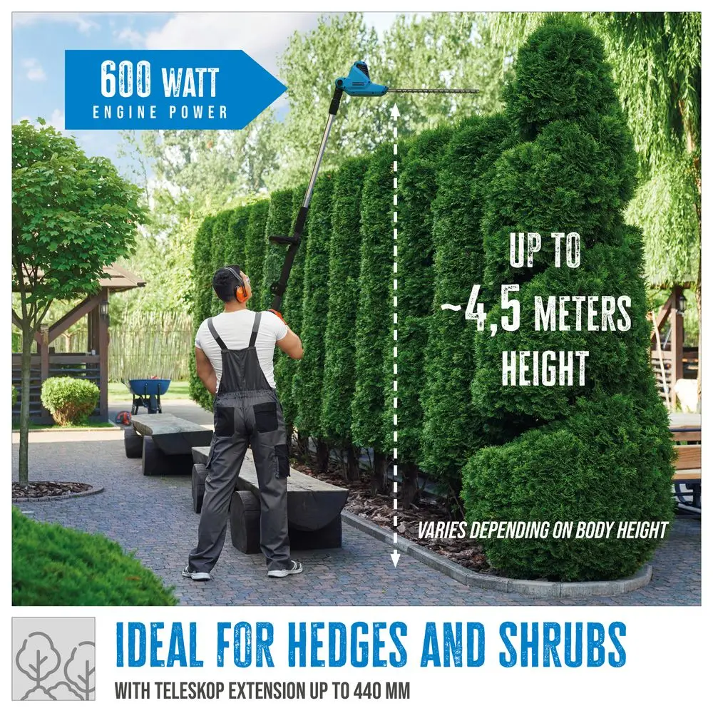 Teleskopowe nożyce do żywopłotu Güde GTHS 6045.1 to doskonałe narzędzie do pielęgnacji wysokich żywopłotów i krzewów. Długość cięcia 450 mm i maksymalna grubość cięcia 18 mm sprawiają, że idealnie nadają się do pielęgnacji krzewów na wysokości do 4-4,5 metra, w zależności od wzrostu użytkownika. Regulowana w 5 pozycjach głowica tnąca zapewnia elastyczność przy różnych kątach cięcia i umożliwia precyzyjną pracę. Teleskopowe przedłużenie o długości 440 mm zapewnia niezbędny zasięg, a miękki uchwyt i dodatkowy uchwyt zapewniają ergonomiczny komfort. Wyłącznik bezpieczeństwa zapobiega przypadkowemu włączeniu, a odciążenie kabla zapewnia płynną obsługę. Dzięki laserowo wycinanym ostrzom i solidnej metalowej przekładni nożyce do żywopłotu są trwałe. Dołączona osłona ostrza i pasek do przenoszenia zapewniają bezpieczny transport i przechowywanie.