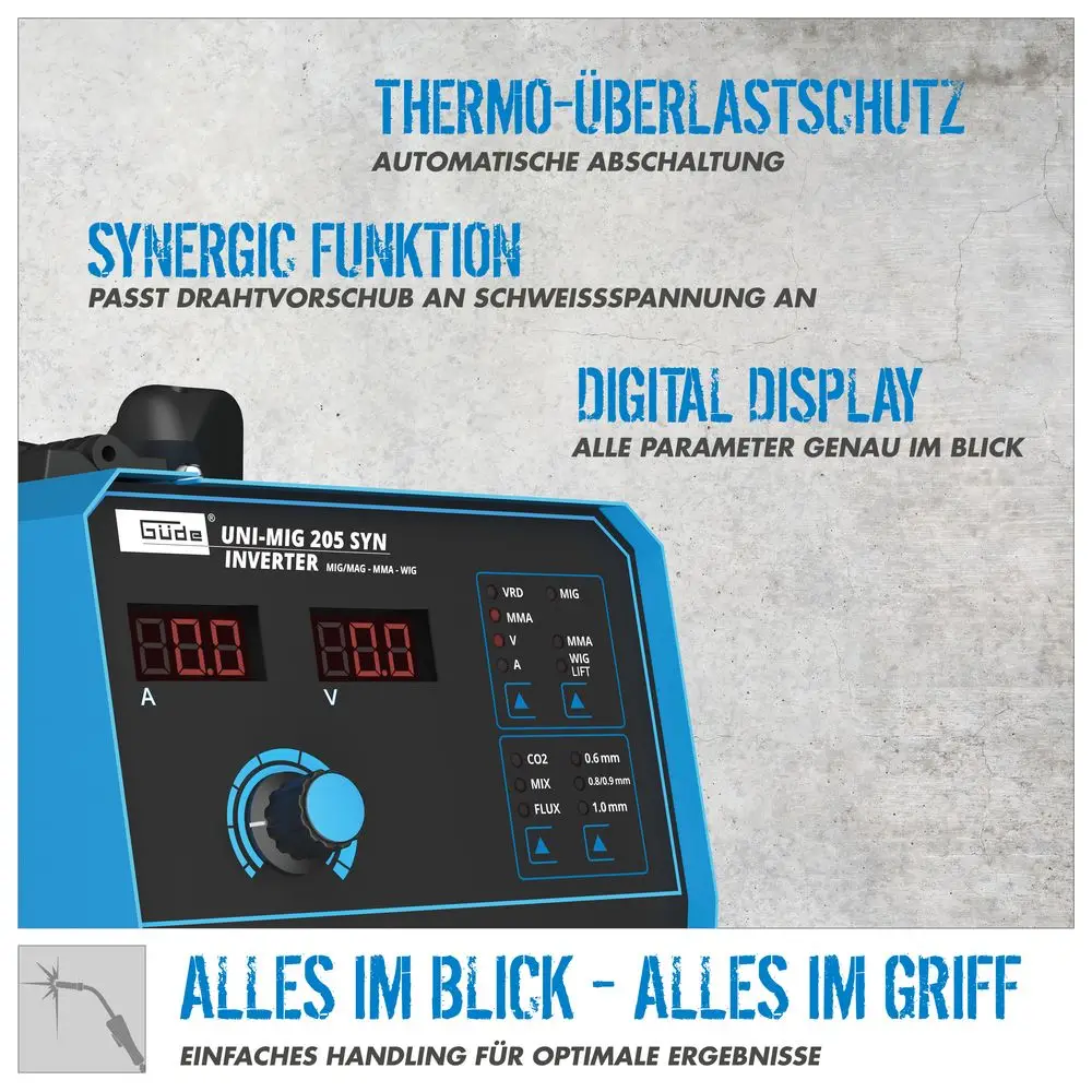 Uni-Mig 205 SYN to jedna z uniwersalnych spawarek inwertorowych w linii produktów Güde. Spawarka Uni-Mig 205 SYN obsługuje praktycznie wszystkie 4 procesy spawania: MIG-MAG, MMA (spawanie elektrodą), spawanie topnikiem (spawanie drutem rdzeniowym) i wreszcie spawanie metodą TIG (opcjonalnie). Technologia inwertorowa wspierana przez IGBT zapewnia niezwykle szybkie procesy przełączania i precyzyjną regulację prądu spawania, co upraszcza spawanie cieńszych blach i znacznie ogranicza tworzenie się ściegów spawalniczych. Sprawdzone funkcje dodatkowe, takie jak Anti-Stick, Hot Start i Arc Force zapewniają maksymalny komfort spawania, nawet w trudnych warunkach. Nowy, innowacyjny, sterowany synergicznie podajnik drutu automatycznie dostosowuje się do odpowiedniej prędkości po wybraniu procesu spawania, grubości drutu i grubości spawania. Te dodatkowe funkcje umożliwiają początkującym i niedoświadczonym spawaczom natychmiastowe osiągnięcie dobrych wyników spawania. Uchwyt elektrodowy i zacisk masy, a także tarcza spawalnicza i młotek szczotkowy do spawania metodą MMA są oczywiście standardowym wyposażeniem. To samo dotyczy oczywiście uchwytu MIG-MAG i regulatora ciśnienia gazu osłonowego. Wózek spawalniczy, który również wchodzi w zakres dostawy, zapewnia porządek i maksymalną mobilność.