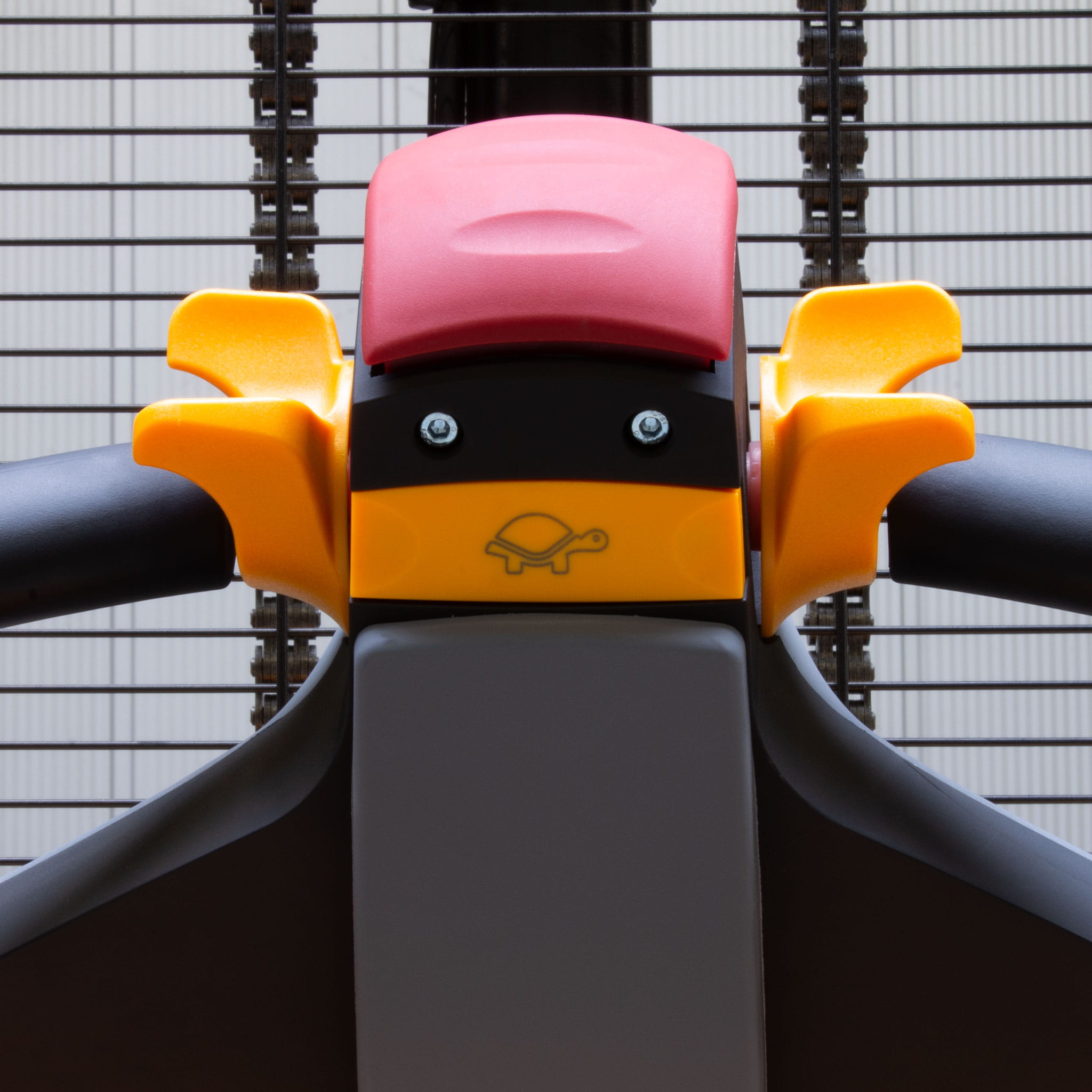 - Bezpieczna eksploatacja – przycisk awaryjny STOP, hamulec elektromagnetyczny, ogranicznik prędkości i dźwięk cofania.
