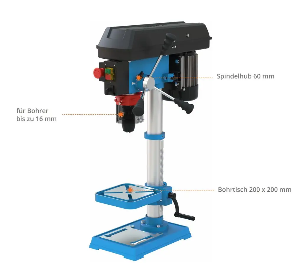 - Maks. Odległość między uchwytem wiertarskim a stołem wiertarskim 290 mm