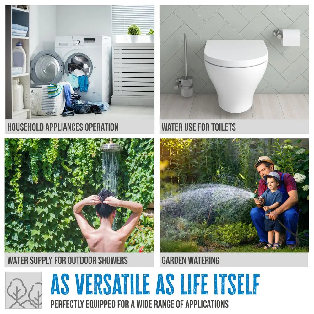 Obszar zastosowań: Do automatycznego zaopatrywania w wodę lub nawadniania domu, podwórza i ogrodu wodą deszczową, użytkową lub gruntową, a także do pompowania wody ze studni i cystern.