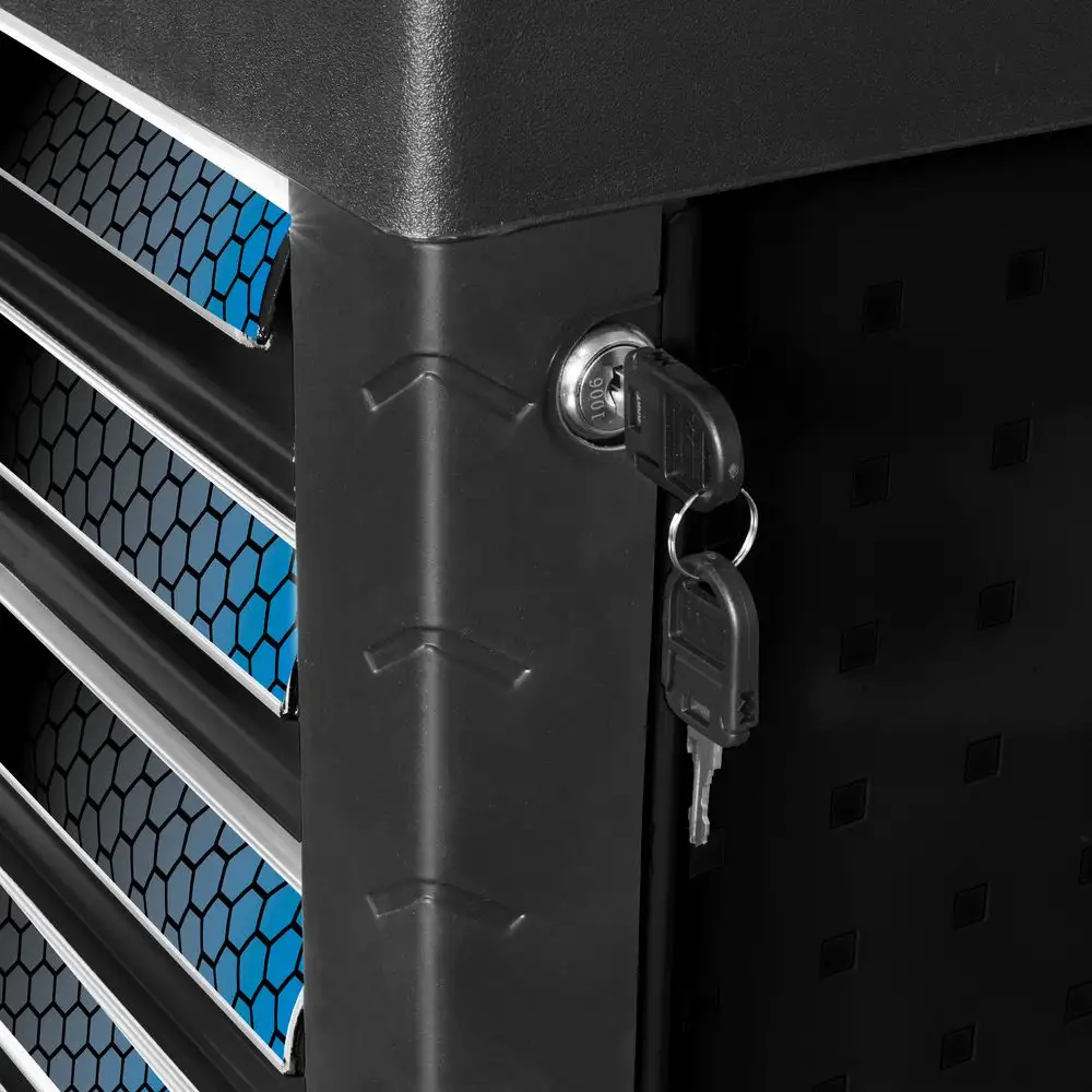 Wózek warsztatowy GW Black Line jest wyposażony w 226-częściowy zestaw narzędzi, który jest bezpiecznie przechowywany w szufladach z prowadnicami kulkowymi o pełnym wysuwie. Jeśli chodzi o bezpieczeństwo i stabilność, wózek imponuje wysuwanym zabezpieczeniem szuflad, zabezpieczeniem krawędzi, centralnym zamkiem z 2 kluczami i hamulcami postojowymi na dwóch obrotowych kółkach, dzięki czemu wszystko pozostaje na swoim miejscu, nawet gdy wózek jest przemieszczany. Standardowa perforacja ścian bocznych umożliwia wiele dodatkowych opcji rozbudowy w celu dołączenia akcesoriów, takich jak dodatkowe uchwyty na narzędzia. Porządek również nie jest zaniedbywany, ponieważ przejrzyście zorganizowane wkładki narzędziowe oznaczają, że każdy może natychmiast znaleźć to, czego szuka. Duża powierzchnia do przechowywania z ramą zapobiega staczaniu się wózka i oferuje bezpieczne przegródki na małe części i puszki ze sprayem, dzięki czemu ten wózek warsztatowy jest idealnym towarzyszem w warsztacie.