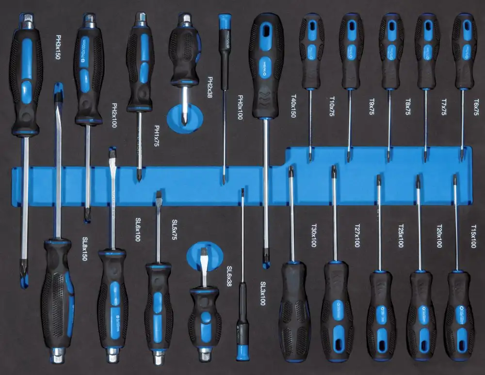 - 21 wkrętaków z miękkim uchwytem, magnetycznych: PHO/PH2*100, PH2*38, PH1*75, PH3*150, SL3/SL6*100, SL6*38, SL5*75, SL8*150, T6/T7/T8/T9/T10*75, T15/T20/T25/T27/T30*100, T40*150