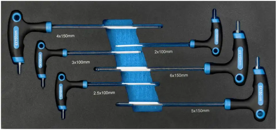 - 6 kluczy imbusowych z końcówką kulistą: 2, 2,5, 3, 4, 5, 6 mm