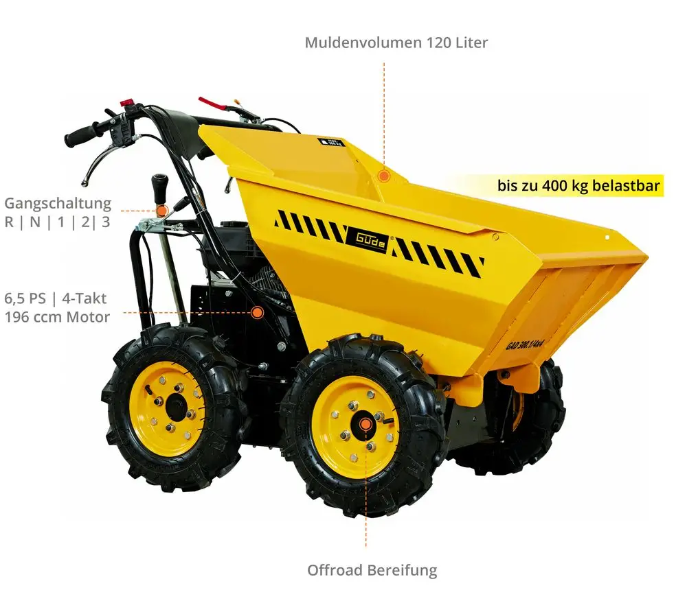 Wozidło samowyładowcze Güde GAD 400.1/4x4 idealnie nadaje się do transportu wszelkiego rodzaju ładunków masowych i drobnicowych.