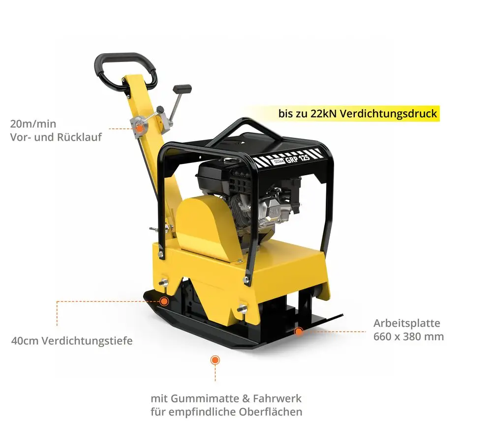 Zagęszczarka güde GRP 125 to idealne rozwiązanie do wymagających prac naprawczych w ogrodnictwie i kształtowaniu krajobrazu. Dzięki dwustronnemu kierunkowi jazdy umożliwia precyzyjną pracę nawet w trudno dostępnych miejscach i zapewnia czysty wzór zagęszczania na szerokiej gamie podłoży. Dzięki zintegrowanemu podwoziu i wytrzymałym rolkom transportowym urządzenie można łatwo przemieszczać i elastycznie wykorzystywać. Składany i tłumiący drgania uchwyt zwiększa komfort obsługi i nie obciąża stawów, nawet podczas długich okresów użytkowania. Wchodząca w zakres dostawy mata poliuretanowa dodatkowo chroni wrażliwe powierzchnie przed uszkodzeniem.