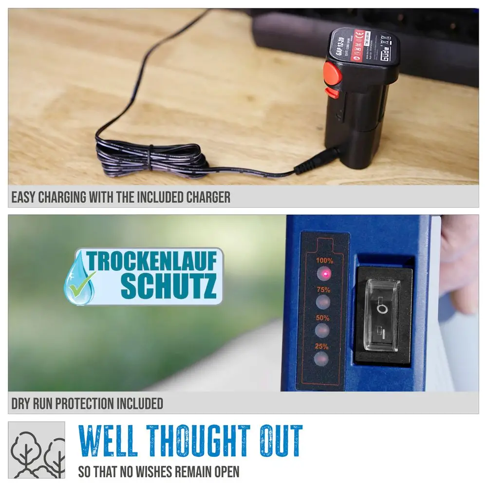 Akumulatorowa pompa do deszczówki Güde RFP 12-201-04 stanowi doskonałą symbiozę nowoczesnej technologii i łatwości obsługi oraz jest niezbędnym narzędziem dla entuzjastów ogrodnictwa. Dzięki zabezpieczeniu przed suchobiegiem, które automatycznie chroni pompę w przypadku braku wody, żywotność urządzenia jest znacznie wydłużona. Zintegrowany wskaźnik poziomu naładowania akumulatora i łatwo wymienialny akumulator litowo-jonowy 12 V zapewniają, że zawsze jesteś gotowy do działania. Praktyczne funkcje, takie jak zawór odcinający i uniwersalne złącze węża, sprawiają, że obsługa jest dziecinnie prosta, a teleskopowa regulacja umożliwia elastyczną regulację głębokości zanurzenia w zakresie od 540 mm do 1000 mm. Niezależnie od tego, czy chodzi o nawadnianie ogrodu z beczek na deszczówkę, czy o szybkie opróżnianie basenów i oczek wodnych - ta pompa poradzi sobie ze wszystkimi zadaniami. A dzięki akumulatorowi i ładowarce wchodzącym w zakres dostawy masz wszystko, czego potrzebujesz do wydajnego i wygodnego zarządzania wodą we własnym ogrodzie.
