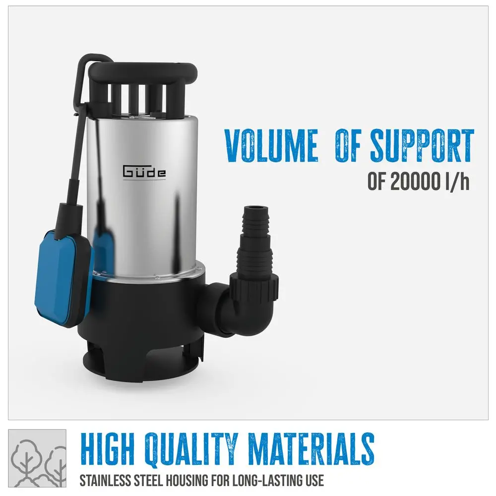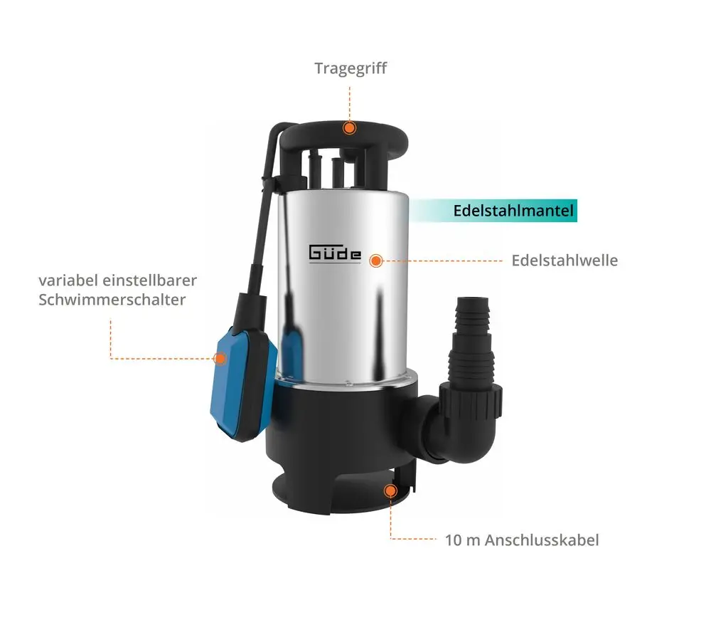 W przypadku zalania pomieszczeń należy szybko podjąć działania, aby woda nie wyrządziła jeszcze większych szkód. W takiej sytuacji niezbędna jest zatapialna pompa odwadniająca. Gdy tylko woda zostanie wykryta, pompa umożliwia podjęcie natychmiastowych działań. Zatapialna pompa ściekowa GS 1103 PI firmy Güde jest wszechstronna i dlatego może być również stosowana w innych obszarach. Niezawodnie odprowadza nie tylko silnie zabrudzone obszary, ale także doły, wodę ogrodową, stawy itp. do 40 mm. Regulowany wyłącznik pływakowy steruje pompą i zapewnia, że nie zostanie ona uszkodzona po wypompowaniu wody. Ochronna pompa zanurzeniowa ma obudowę ze stali nierdzewnej i wał ze stali nierdzewnej, aby zapobiec rdzewieniu. Posiada również zabezpieczenie termiczne, które zapewnia automatyczne wyłączenie bezpieczeństwa w przypadku przegrzania silnika. Wirnik jest wykonany ze stabilnego wymiarowo Norylu. Pompa posiada uszczelnienie mechaniczne, które zapewnia najlepszą możliwą ochronę wewnętrznej obudowy przed wodą. Poręczna pompa zanurzeniowa do ścieków jest również wyposażona w uchwyt do przenoszenia i 10-metrowy kabel połączeniowy.