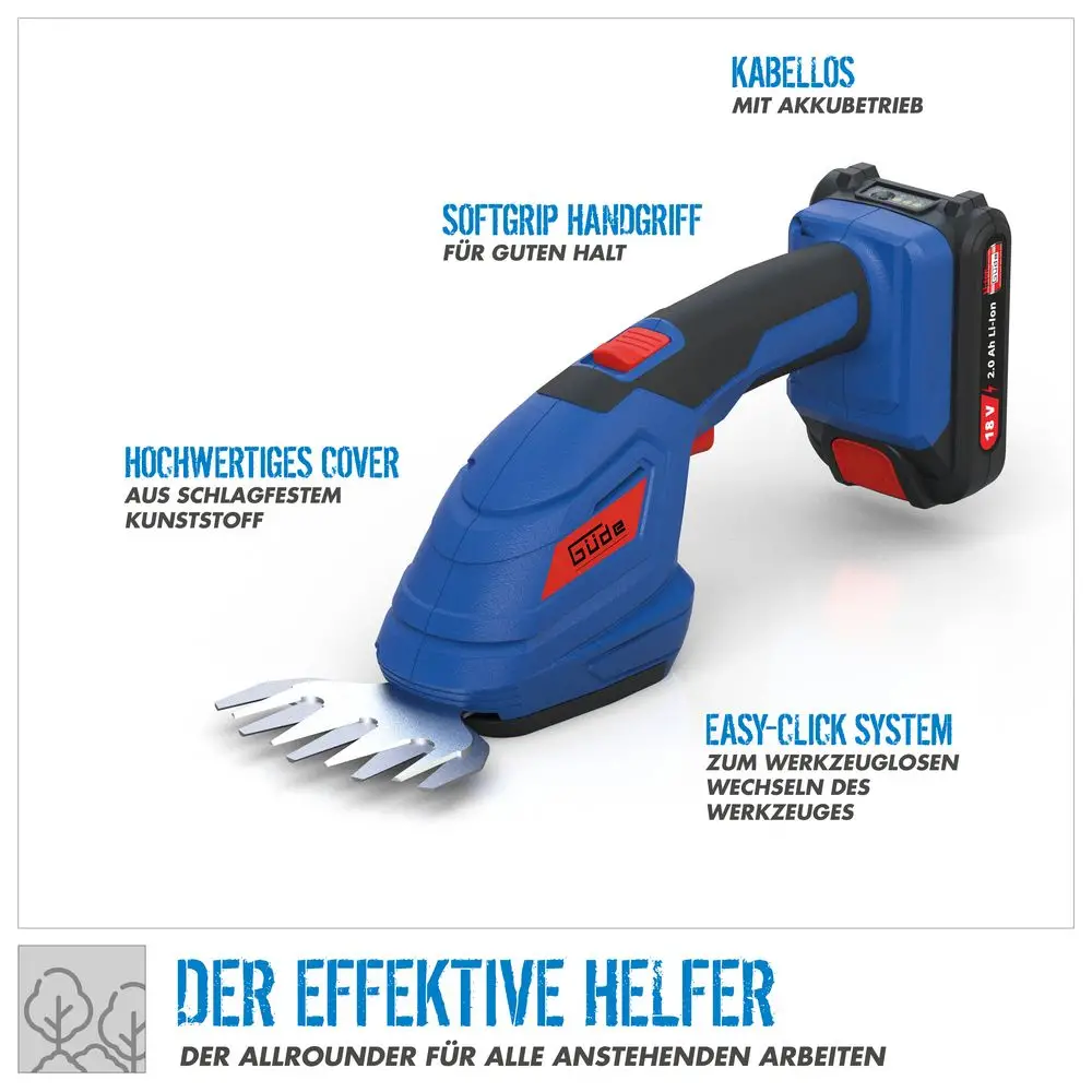 bezprzewodowy zestaw do pielęgnacji ogrodu GPS 18-0, w tym nożyce do trawy, nożyce do żywopłotów/krzewów i grabie, akumulator 2 Ah i ładowarka 0,5 A.