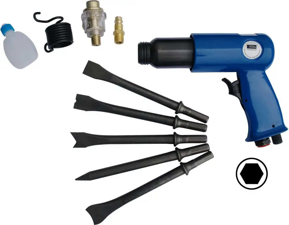 Zestaw młotków pneumatycznych Güde to wszechstronne narzędzie do projektów domowych i rzemieślniczych, wyposażone w sześciokątny uchwyt zapewniający pewny chwyt i trwałość. Umieszczony w praktycznej walizce zapewniającej ochronę i porządek, zestaw zawiera złączkę do systemów sprężonego powietrza, a także wybór dłut (płaskich, nitowych, uniwersalnych, spiczastych i tnących) o długości 175 mm. Sprężyna mocująca do bezpiecznej wymiany dłuta i butelka oleju do konserwacji uzupełniają ten wysokiej jakości zestaw, idealny do różnych prac związanych z dłutowaniem.