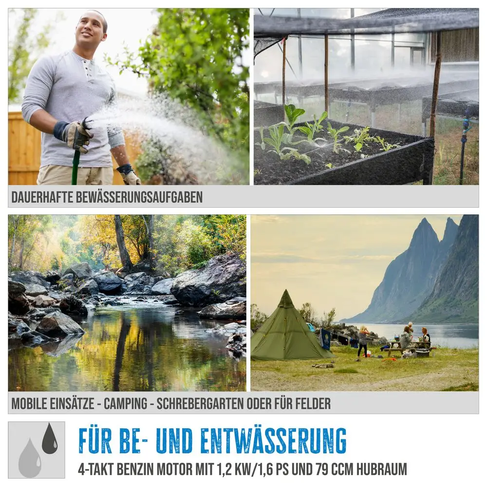 Do pompowania czystej lub lekko zanieczyszczonej wody. Idealne rozwiązanie do zastosowań bez zasilania sieciowego - np. do odwadniania awaryjnego, do użytku na polach, placach budowy lub do podlewania ogrodów