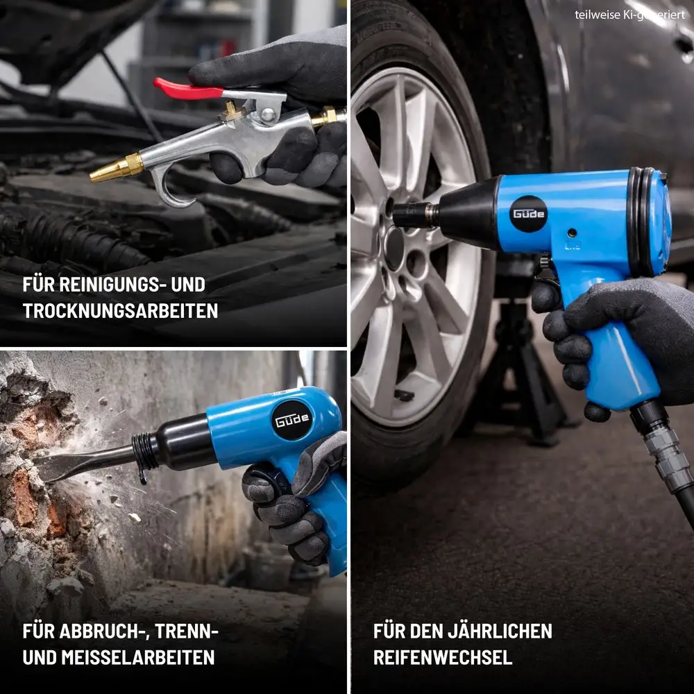 Bardzo praktyczny i wszechstronny zestaw narzędzi pneumatycznych z bogatym wyposażeniem, którego nie powinno zabraknąć w żadnym warsztacie. Zestaw zawiera klucz udarowy i odpowiednie nasadki do corocznej wymiany opon, a także klucz zapadkowy do innych prac montażowych i naprawczych. Ponadto w zestawie znajduje się młotek dłutujący i pistolet do przedmuchiwania z odpowiednimi przystawkami i narzędziami. Wreszcie, zestaw uzupełnia szlifierka pneumatyczna z kamieniami szlifierskimi i papierem ściernym do delikatnych prac. Oczywiście w zestawie znajduje się również olej do sprężonego powietrza i taśma uszczelniająca do podłączenia złączek sprężonego powietrza.