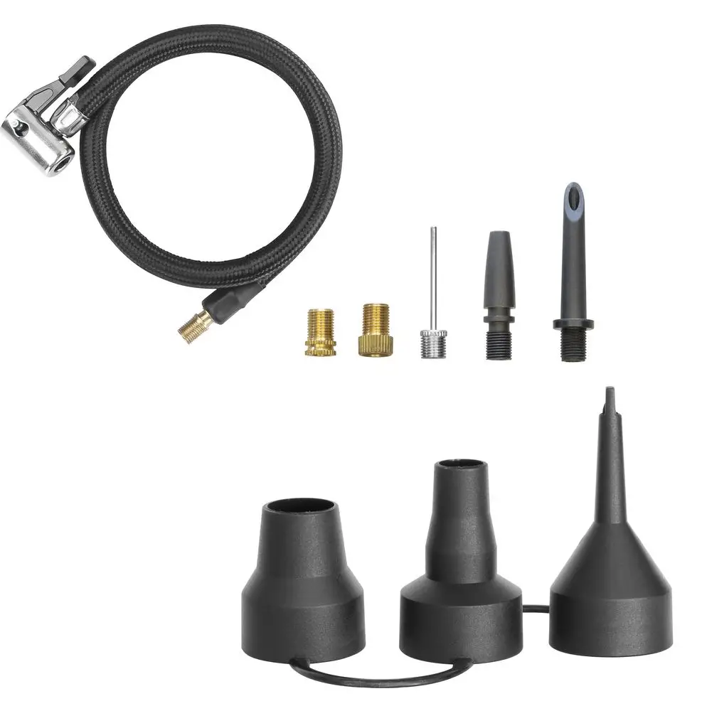 kompresor KLS 18-0 z wężem i 5-częściowym zestawem dysz, pompka powietrza KLS 18-0 z 3-częściowym zestawem dysz, bez akumulatora i ładowarki.