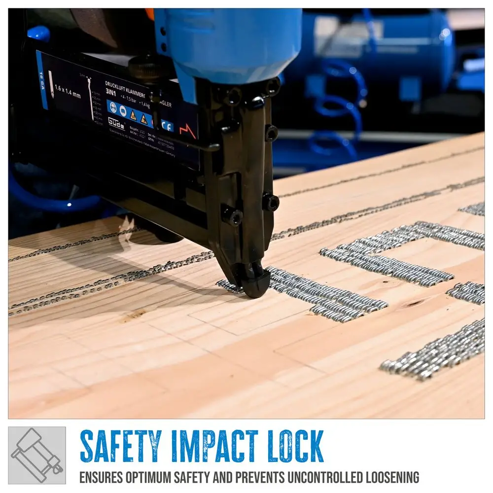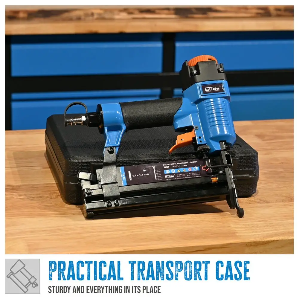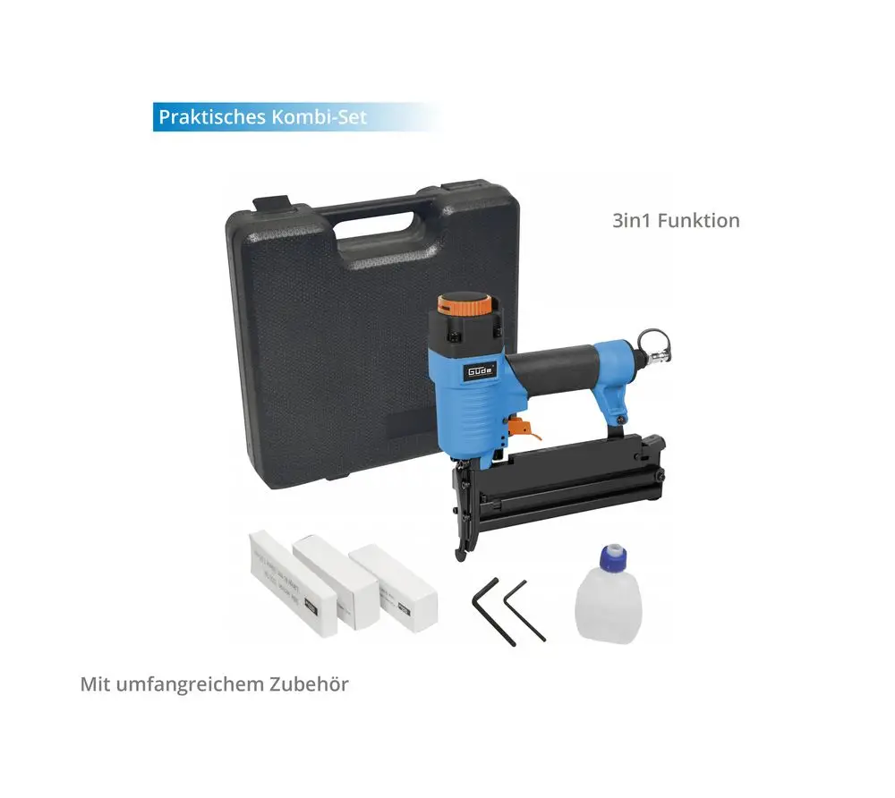 Zszywacz pneumatyczny Güde 3w1 to wielofunkcyjne narzędzie przeznaczone do wszechstronnych prac związanych z mocowaniem. Zakres dostawy obejmuje praktyczną walizkę transportową, która zapewnia bezpieczeństwo i porządek narzędzia i jego akcesoriów. Zintegrowana blokada udarowa zapewnia bezpieczeństwo podczas użytkowania. W zestawie znajduje się butelka oleju do konserwacji i pielęgnacji urządzenia. W zestawie znajdują się również dwa klucze sześciokątne, które umożliwiają regulację lub naprawę urządzenia. Zestaw zawiera również asortyment materiałów mocujących, w tym 200 zszywek 5,7 mm o długości 20 mm, 500 gwoździ 2 mm o długości 25 mm i 100 gwoździ 3 mm, również o długości 25 mm. Wybór ten umożliwia szeroki zakres zastosowań, od drobnych do bardziej wytrzymałych prac mocujących. Podsumowując, zszywacz pneumatyczny Güde 3w1 jest elastycznym i wydajnym rozwiązaniem dla szerokiej gamy projektów w sektorze DIY i handlu.